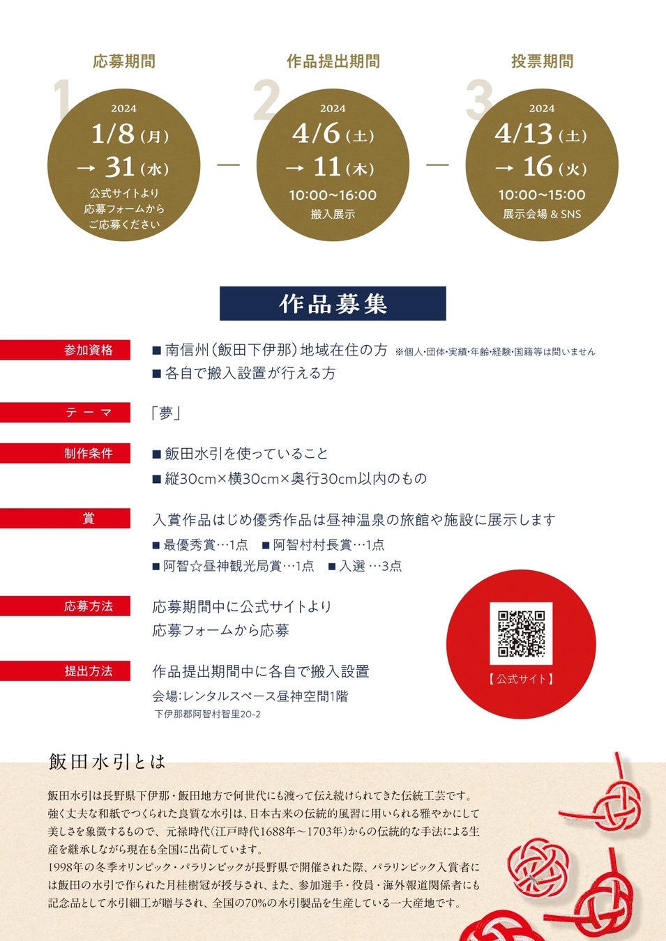 飯田水引を使い規定のサイズ内に収まる自由な作品を作成いただき、春には一般投票による優秀作品を決定いたします。優秀作品をはじめとした入賞作品は、昼神温泉の旅館や観光施設に展示いたします。