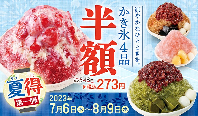 1つ目は、夏と言えば…「かき氷」ということで、人気のかき氷4品が通常価格548円のところ半額の273円でご注文頂けます。