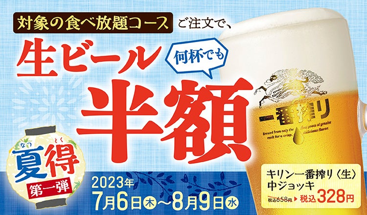そして2つ目の夏得は、対象の食べ放題コースをご注文頂くと「生ビール(中ジョッキ)」が通常658円のところ半額の328円に♪