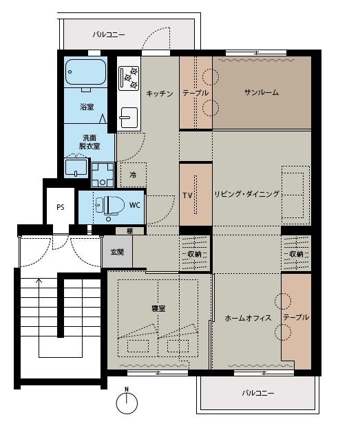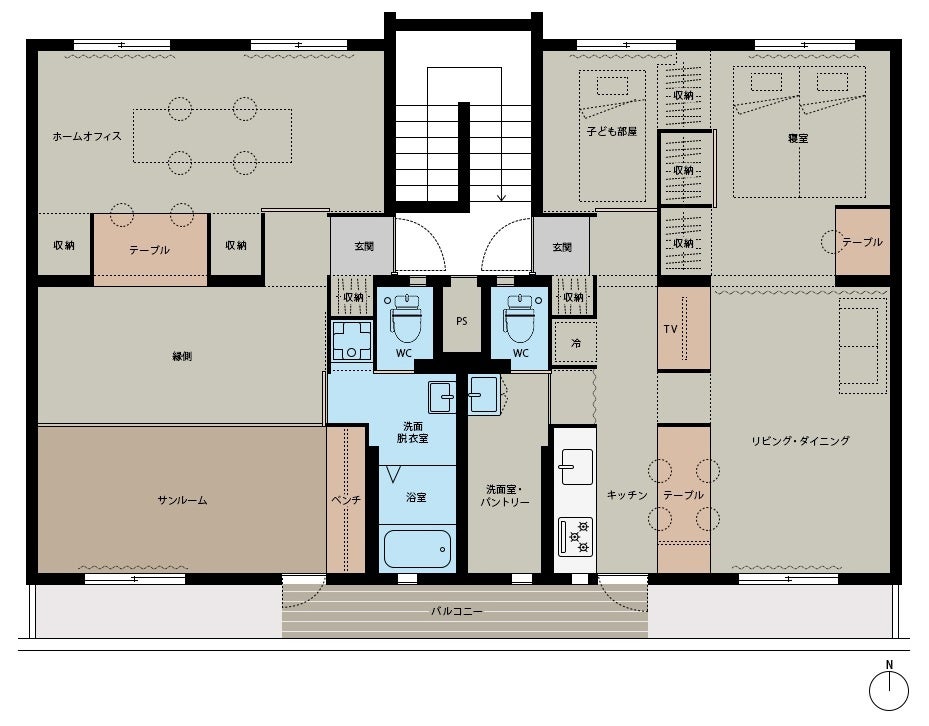 「はなれ」は入浴や運動など「じぶん時間」を楽しむ空間として捉え、南側に「サンルーム」、北側に「ホームオフィス」を設けています。カーテンとテーブルで緩やかに仕切り、一体の居室として自然通風が快適に確保されているサステナブルで豊かな空間となっています(ホームオフィス部分を分割し、2部屋にしたプラン(5LDK)も併せて募集します)。
