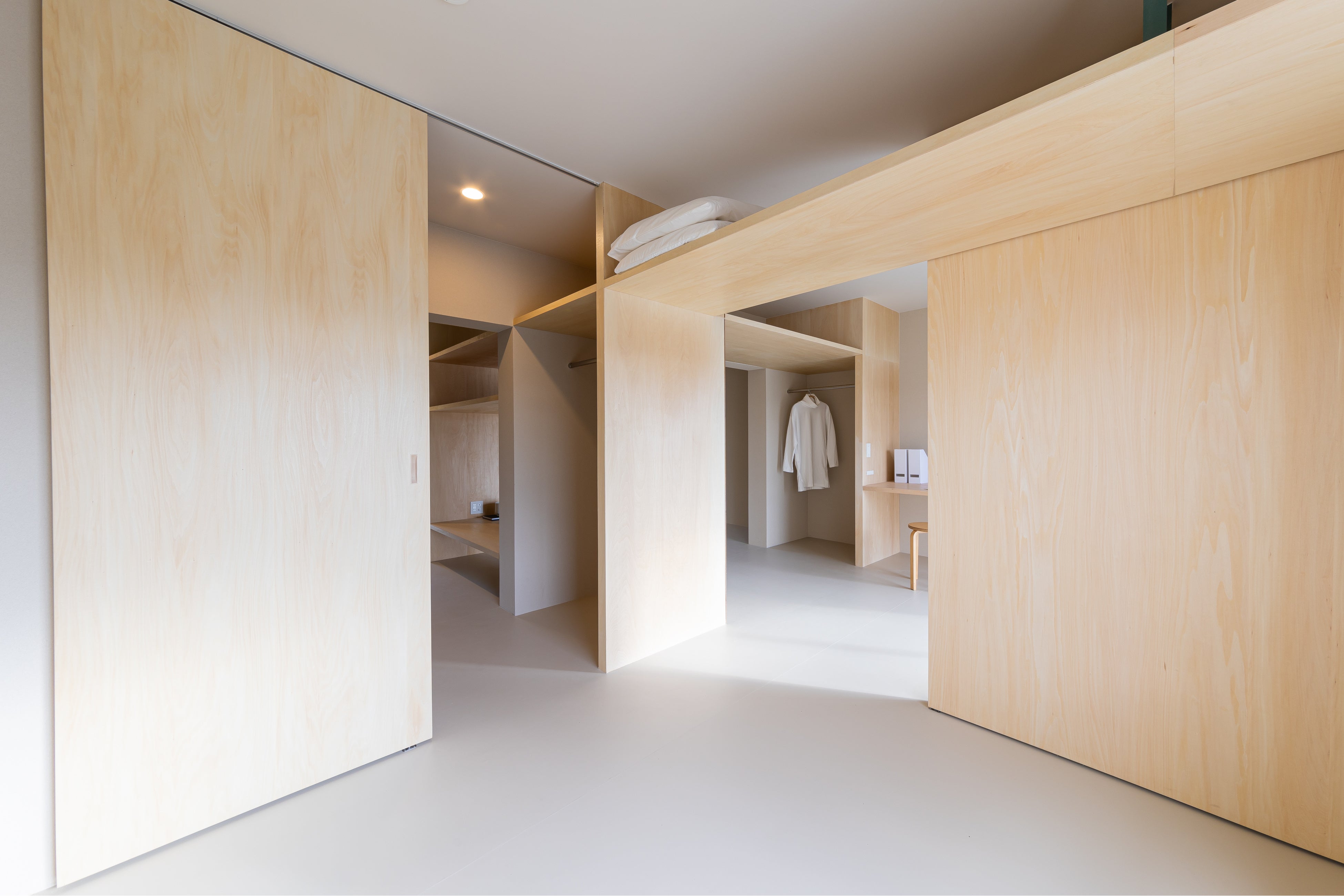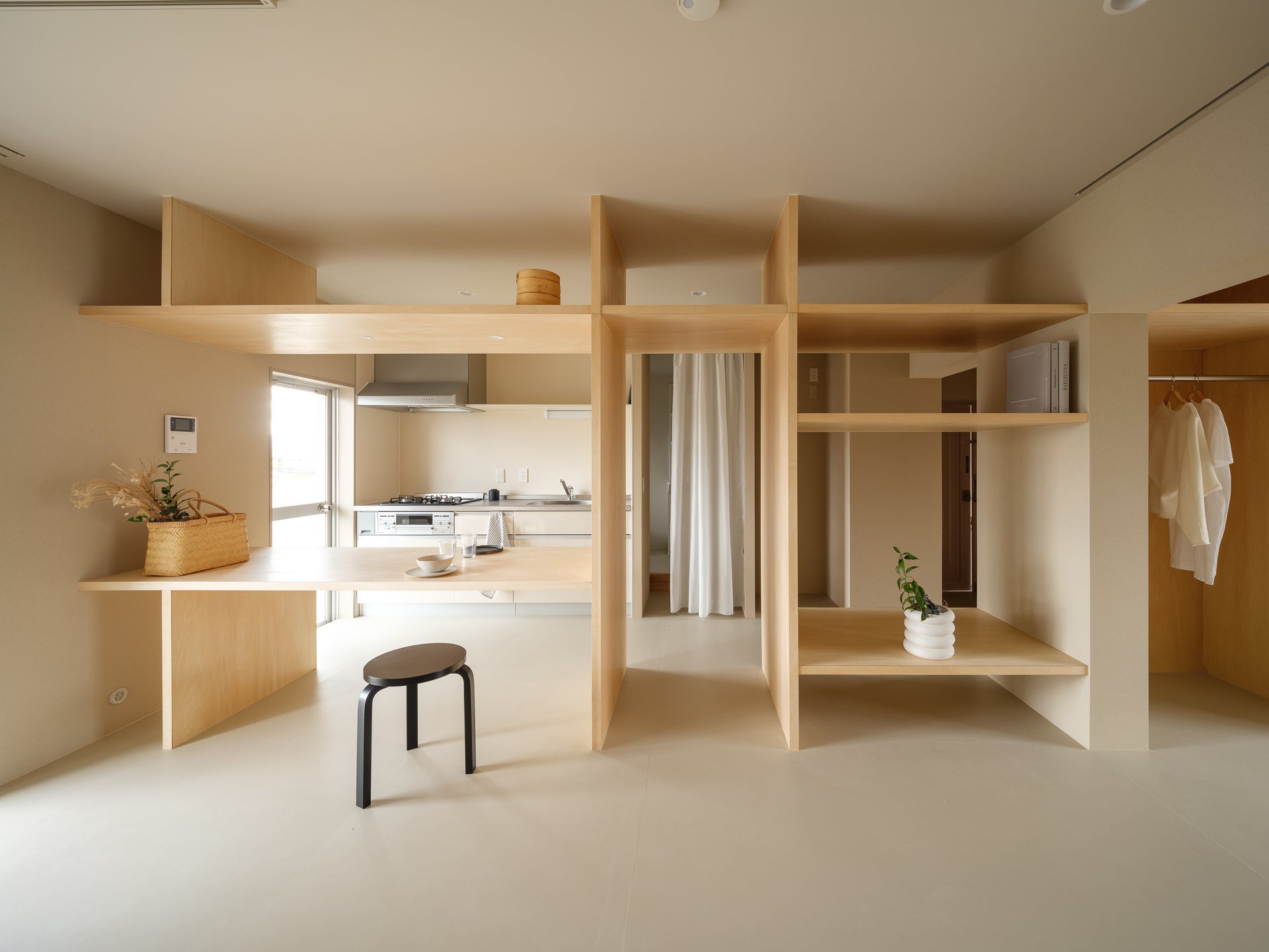 バルコニーに面してホームオフィスを設け、一年を通じて自然光や自然通風を取り入れた快適な空間を実現しています。リビングは、ダイニング・キッチンと一体化したデザインとすることで、運動や DIY などの「じぶん時間」と食事をともにする「家族の団らん」の時間とを共有できる空間としています。