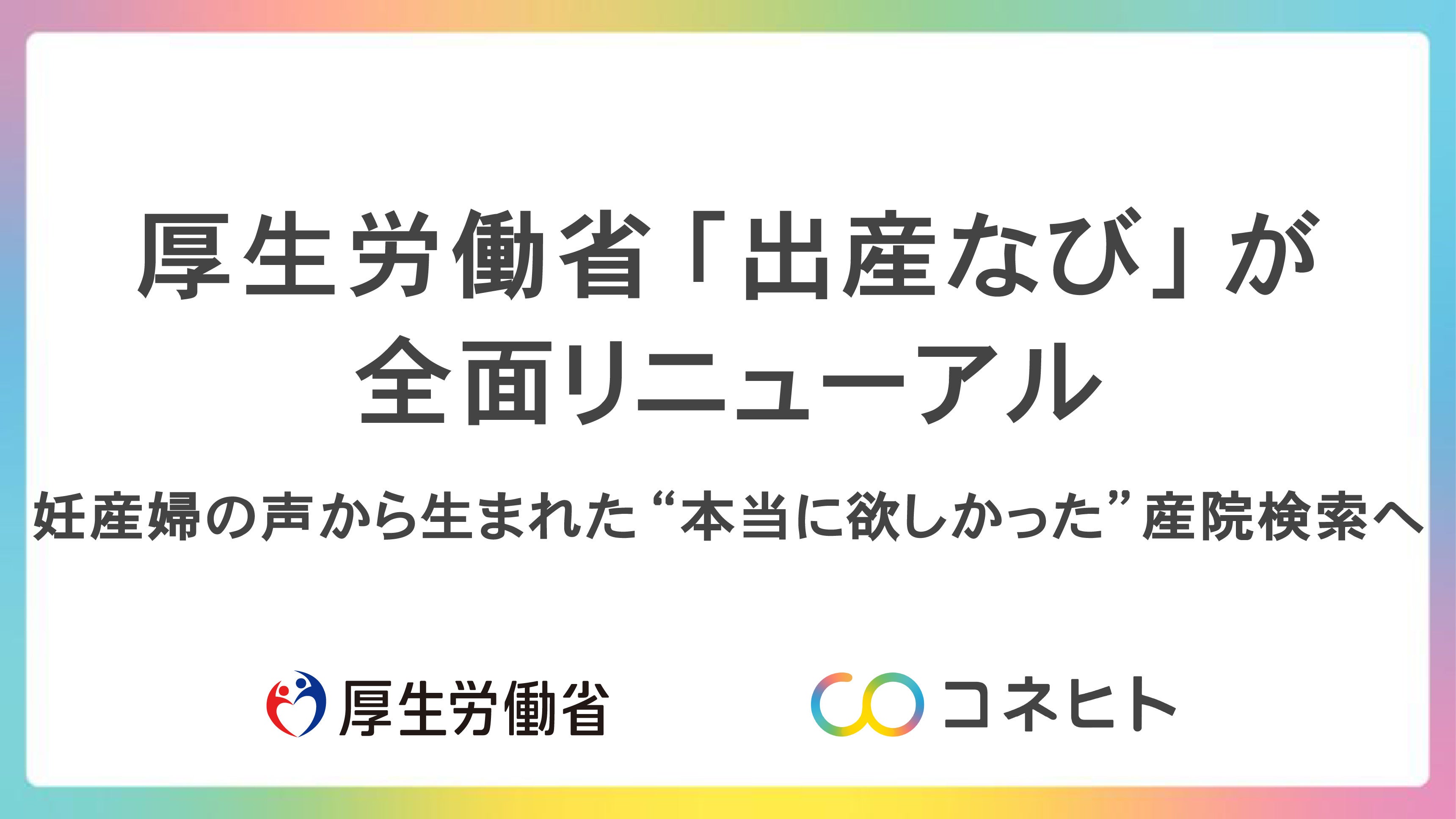 コネヒト株式会社(本社:東京都中央区、代表取締役 杉井信一郎、以下「コネヒト」)は、厚生労働省より令和7年度分娩取扱施設情報提供ウェブサイト「出産なび」の更改および保守・運用業務を受託し、システムおよびUI/UXの全面リニューアルを実施したことをお知らせいたします。