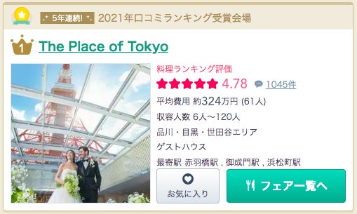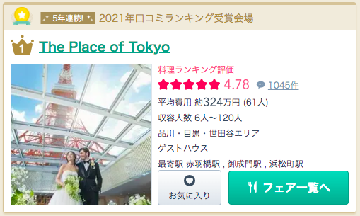 〈東京タワーの目の前の結婚式場 The Place of Tokyo〉ウェディング総合情報サイト みんなのウェディング 結婚式場口コミランキング 5年連続受賞!