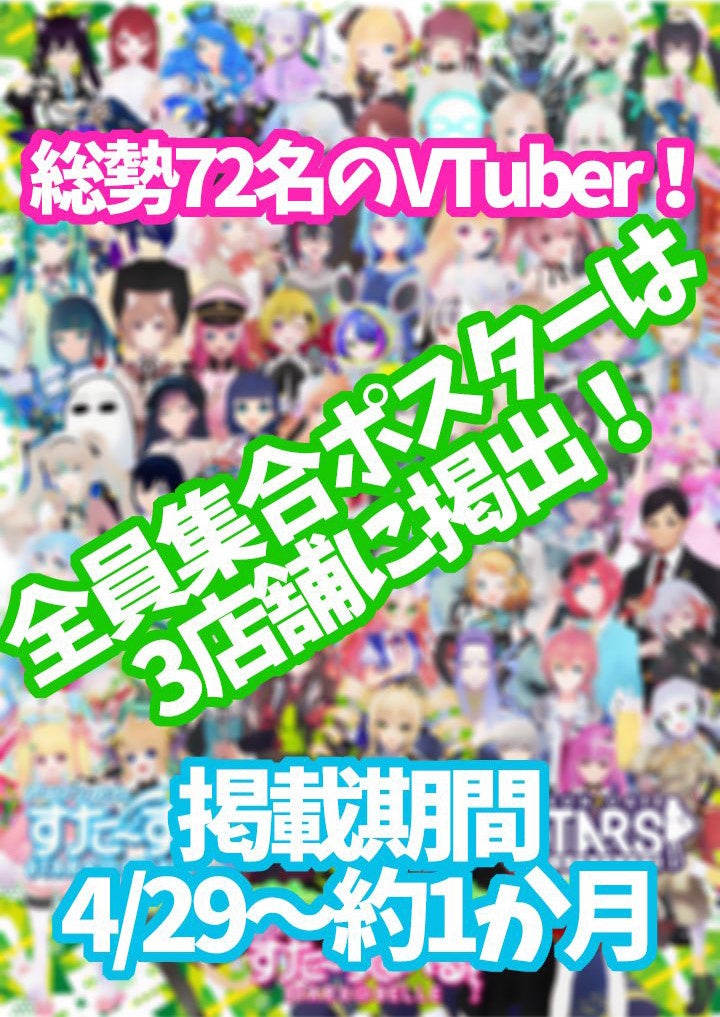 株式会社シティコミュニケーションズ (本社:横浜市神奈川区 / 代表取締役社長:三田大明 )が運営するアニソンカフェ「すた~ず」は、4月29日から約1か月の期間、横浜・秋葉原・池袋の全店舗においてVチューバー応援企画『GWはすた~ずでVTuber発掘』として、Vチューバー72名の広告を無償で店内に掲示します。