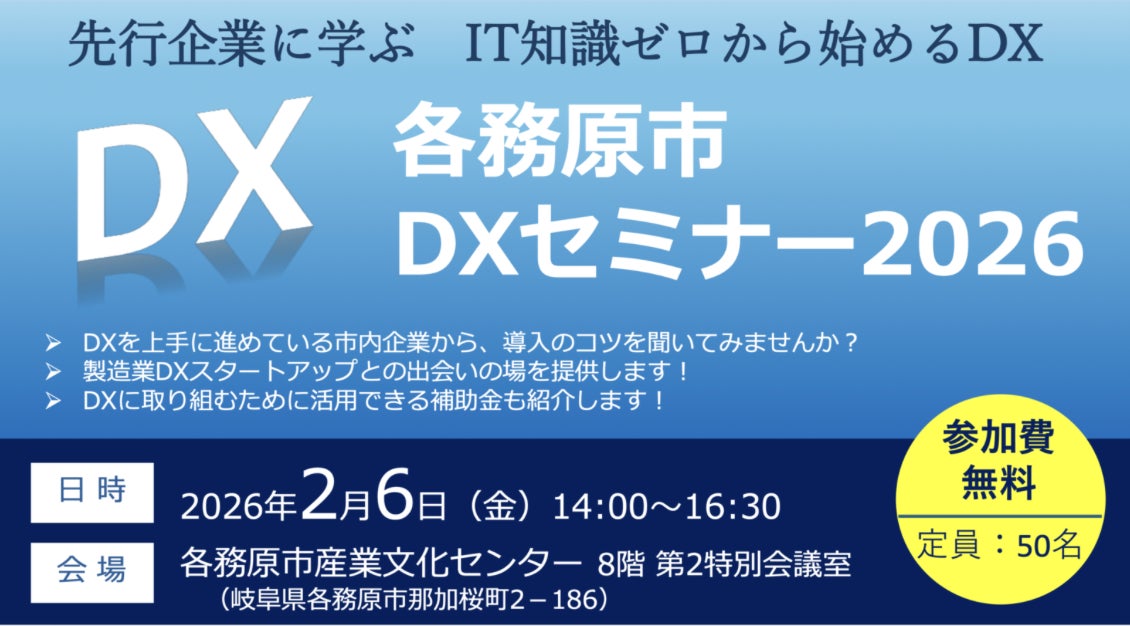 「各務原市 DXセミナー2026」は、DXにこれから取り組みたい企業や、具体的な進め方に悩む企業を対象に、先行してDXを進めている市内企業や製造DXスタートアップの事例から、実践のヒントを学ぶことを目的としたセミナーです。製造現場の課題に寄り添ったリアルな事例紹介に加え、DX推進に活用できる補助金施策の紹介や、参加者同士の情報交換の場も設けられています。