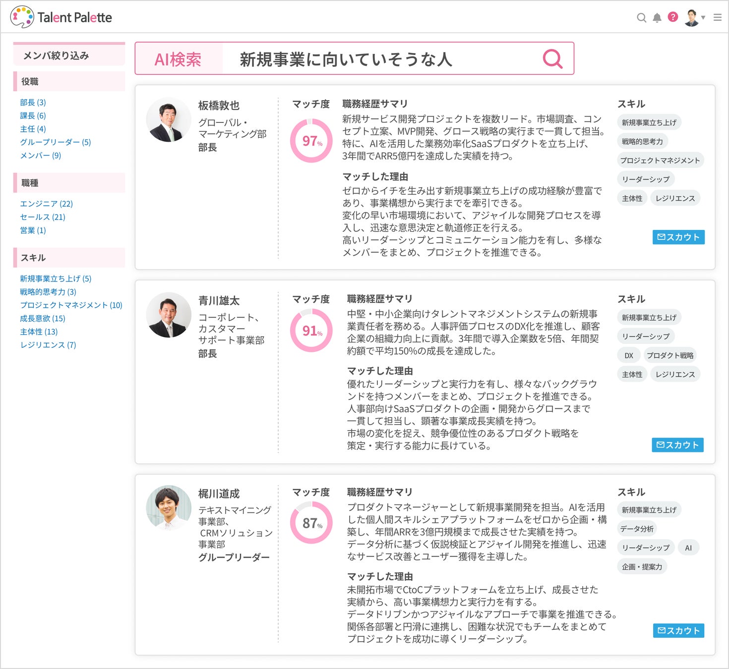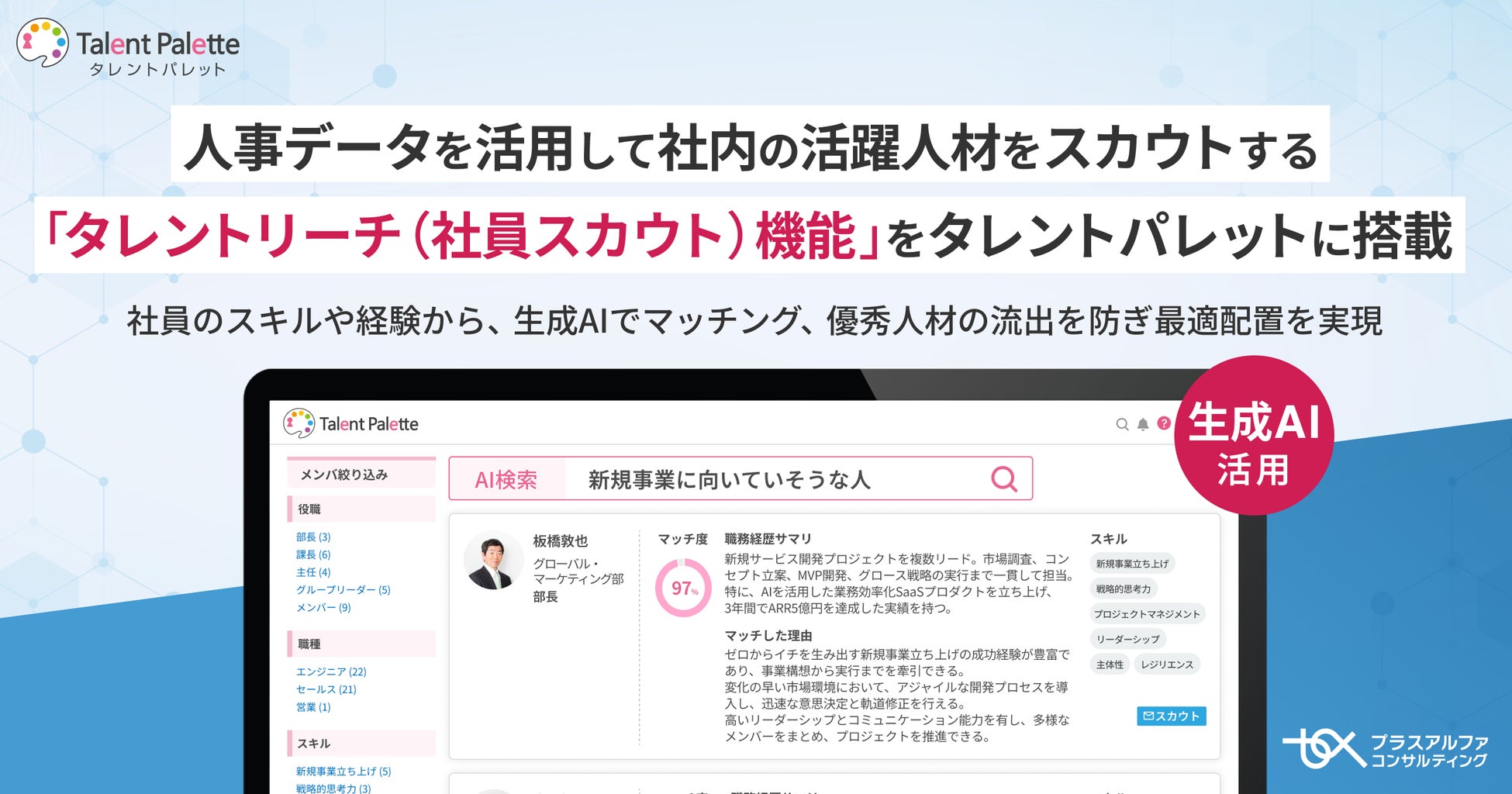 株式会社プラスアルファ・コンサルティング(本社:東京都港区、代表取締役社長:三室克哉、証券コード:4071、以下:PAC)は、科学的な人材活用や人的資本の開示、人事業務のDX化、リスキリング推進などを目的に、多くのエンタープライズ企業で導入が進んでいるタレントマネジメントシステム 「Talent Palette(以下:タレントパレット)」 に蓄積された、社員の所属部門やスキル・経験、性格傾向、キャリア希望といった人材情報から、社内人材を発掘しスカウトできる 「タレントリーチ(社員スカウト)機能」 を新たに搭載します。