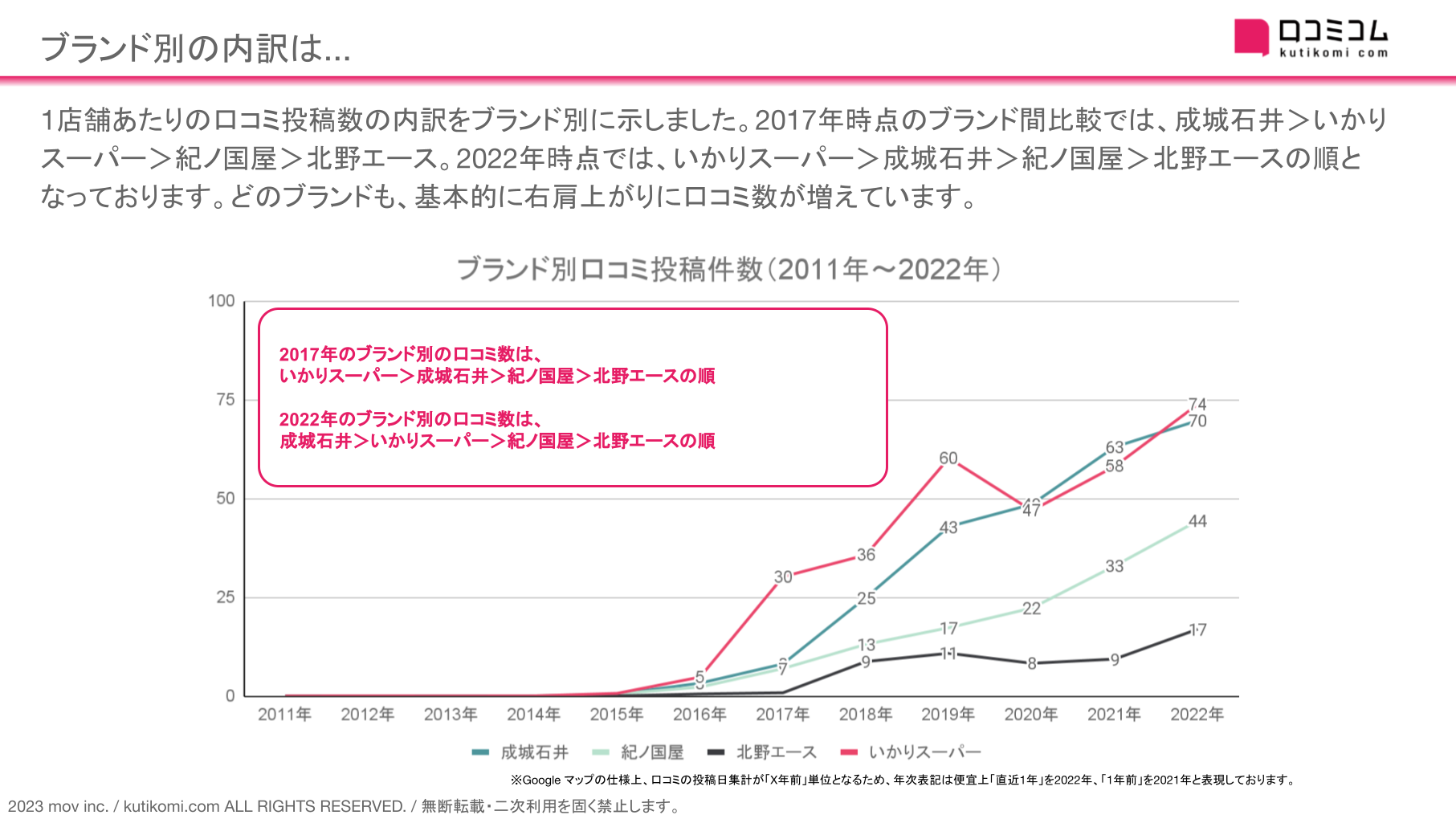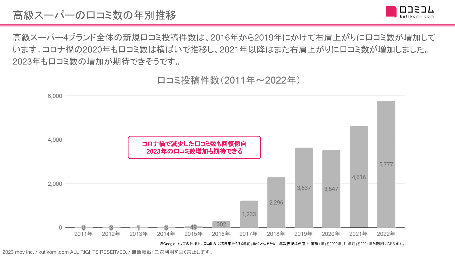 高級スーパー4ブランド全体の新規口コミ投稿件数は、2016年から2019年にかけて右肩上がりに口コミ数が増加しています。コロナ禍の2020年も口コミ数は横ばいで推移し、2021年以降はまた右肩上がりに口コミ数が増加しました。2023年も口コミ数の増加が期待できそうです。