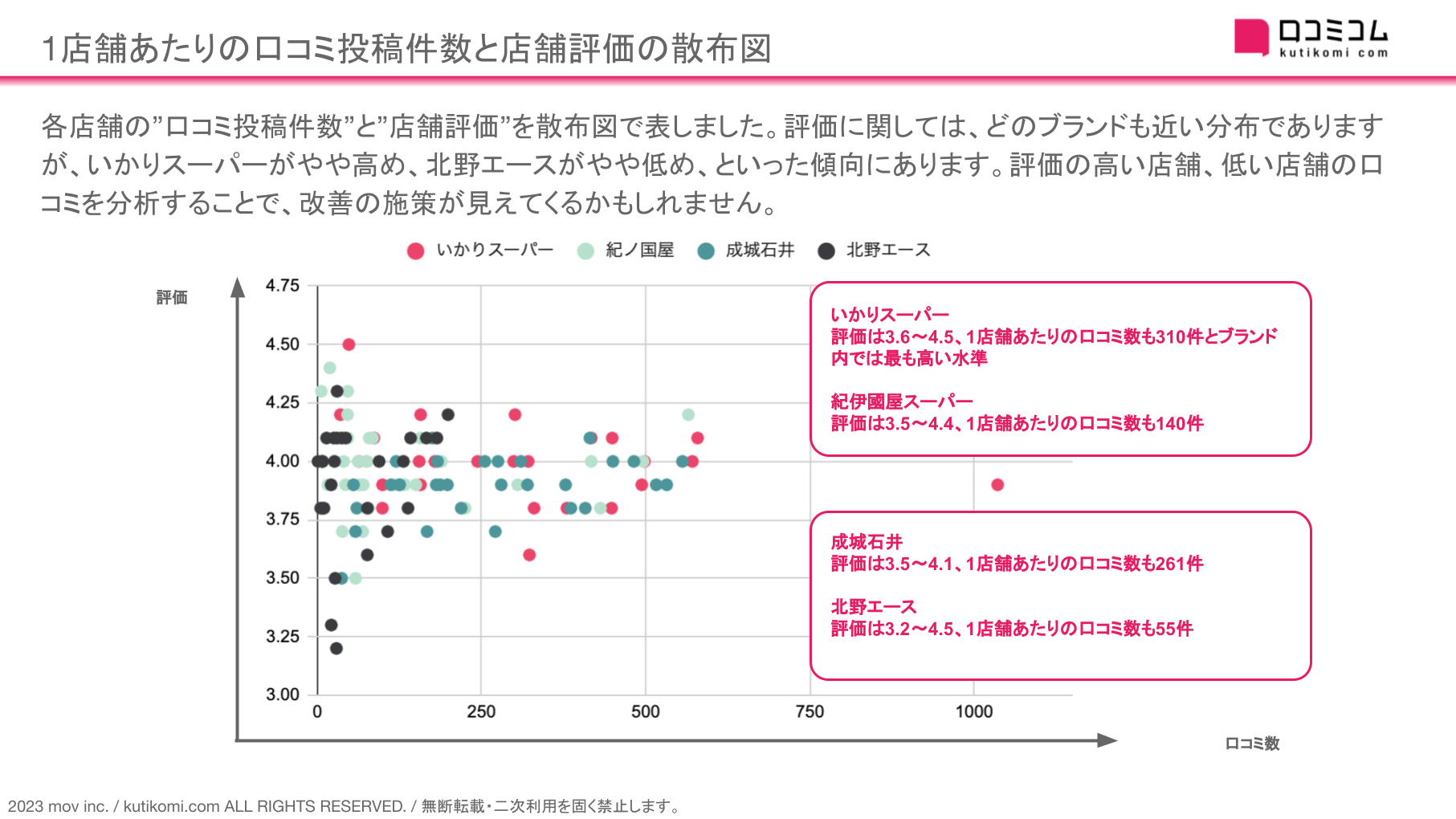 各店舗の”口コミ投稿件数”と”店舗評価”を散布図で表しました。評価に関しては、どのブランドも近い分布でありますが、いかりスーパーがやや高め、北野エースがやや低め、といった傾向にあります。評価の高い店舗、低い店舗の口コミを分析することで、改善の施策が見えてくるかもしれません。