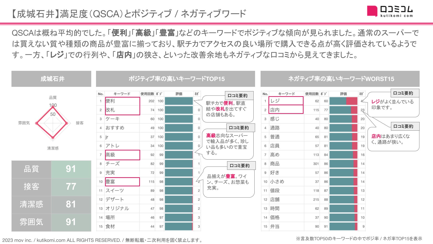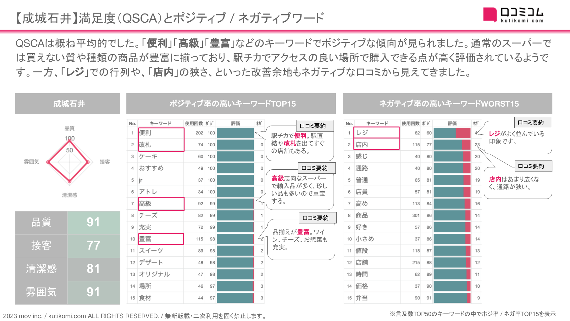 それらのAI解析を用いた分析例として「成城石井」のQSCA・頻出ポジネガキーワードを確認しました。