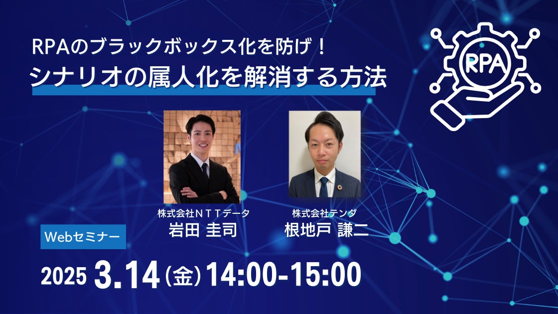マニュアルトータルソリューションを提供する株式会社テンダ(本社/東京都渋谷区、代表取締役会長/小林 謙、以下「テンダ」)は、株式会社NTTデータ(本社/東京都江東区、代表取締役社長/佐々木 裕、以下「NTTデータ」)と、2025年3月14日(金)に、「RPAのブラックボックス化を防げ!シナリオの属人化を解消する方法」と題し、共催ウェビナー(事前登録制・参加無料)を開催いたします。