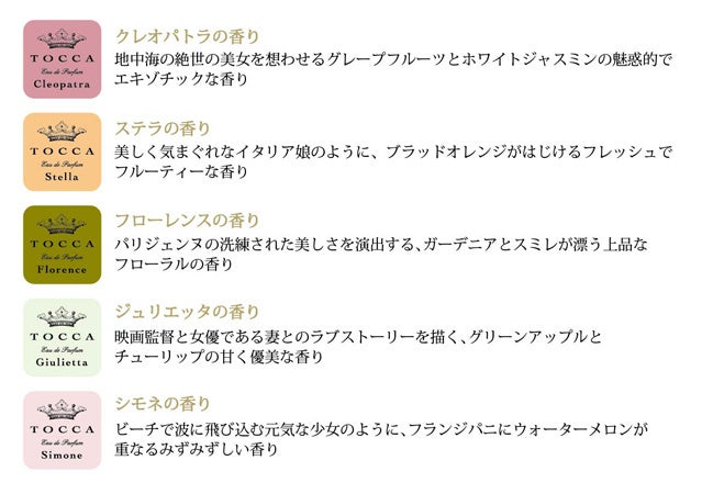 1990年代後半にニューヨークでアパレルブランドとしてスタートした、イタリア語でtouchを意味するTOCCA(トッカ)。 上品なヨーロピアンテイストで表現された女性らしさに満ちたそのコレクションは、ゆったりと休日の旅を楽しむヨーロッパ女性を思い起こさせます。 そして、その感性が必然的に生み出したもの、それが、旅する女性自身の美しさを導き出すための美しくかつ利便性に優れた製品群、「トッカ ビューティー」です。 トッカならではの既成概念にとらわれない自由な発想は、「女性が美しくあるために」という共通項のもと、フレグランス・スキンケア・ランドリーといった既存のカテゴリーを超えた魅力的な製品たちを誕生させました。