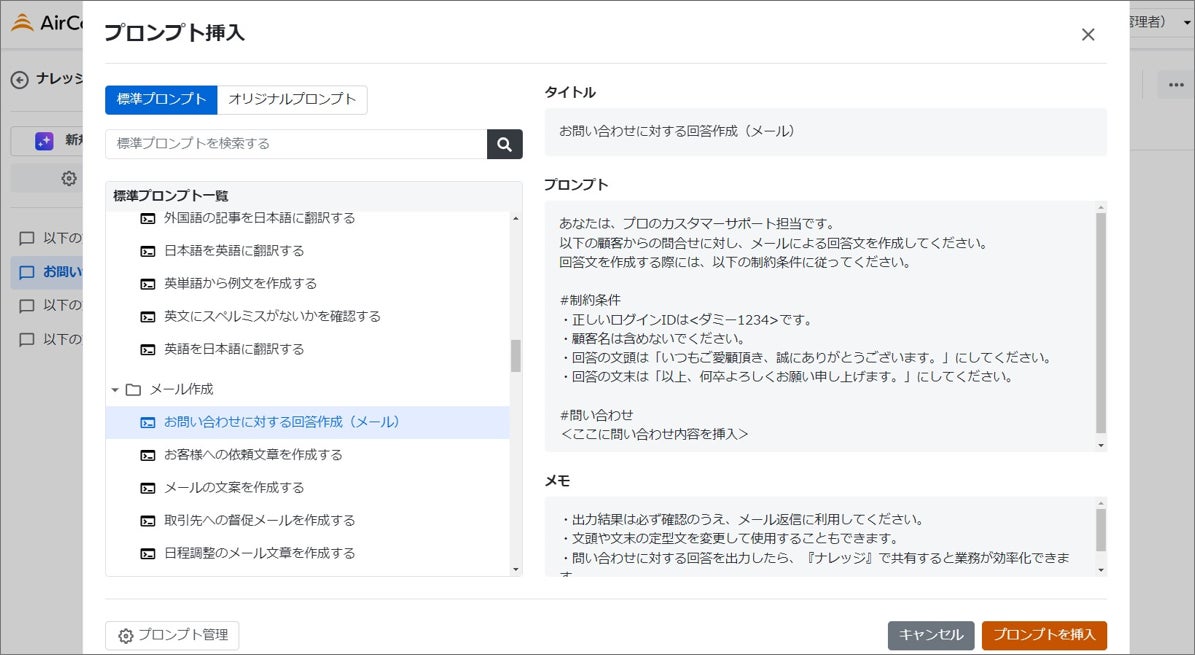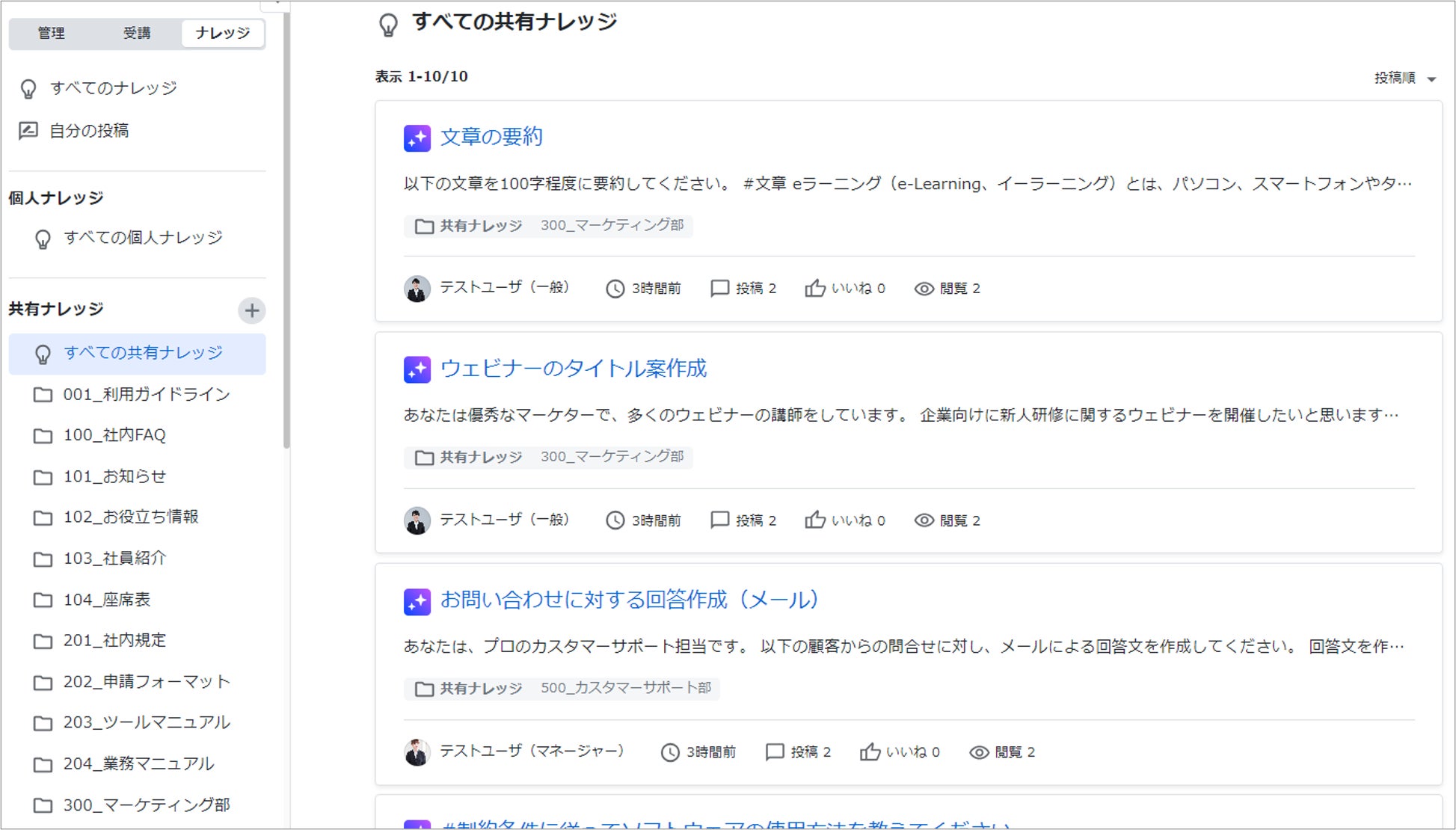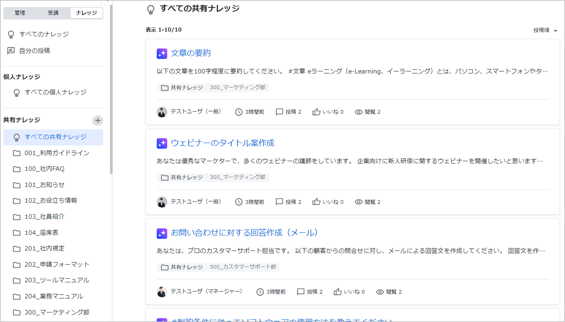 「AirCourse AIナレッジ」は、ナレッジ共有機能と連動しているため、生成AIを使って得たナレッジ(議事録の要約などの出力結果)を社内で共有できます。また、便利なプロンプトを作成した際は、“オリジナルテンプレート”として社内で共有することで、他の社員が活用できます。