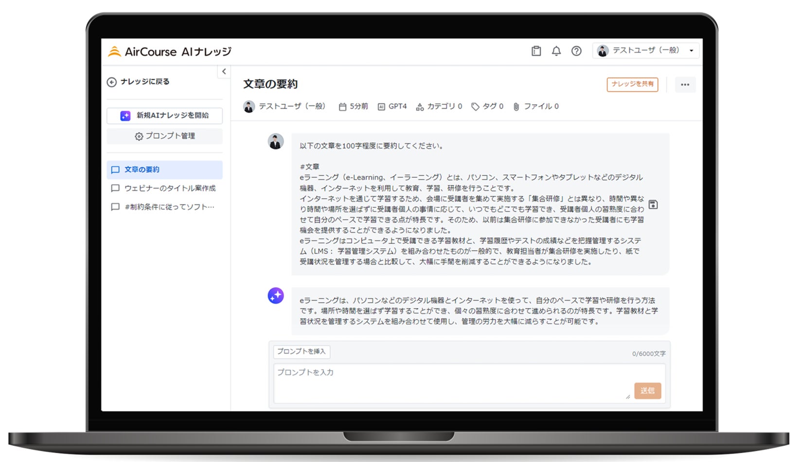 「AirCourse AIナレッジ」は、法人企業が安心して導入でき、はじめて利用する社員も簡単に日常業務に活用できるようにデザインされた生成AIサービスです。また、ナレッジ共有機能との連動により、自社で作成したオリジナルのプロンプトや生成AIを使って得たナレッジを社内で共有することができます。全社員が生成AIを業務で活用し、ナレッジを共有することで生産性の向上が期待できます。