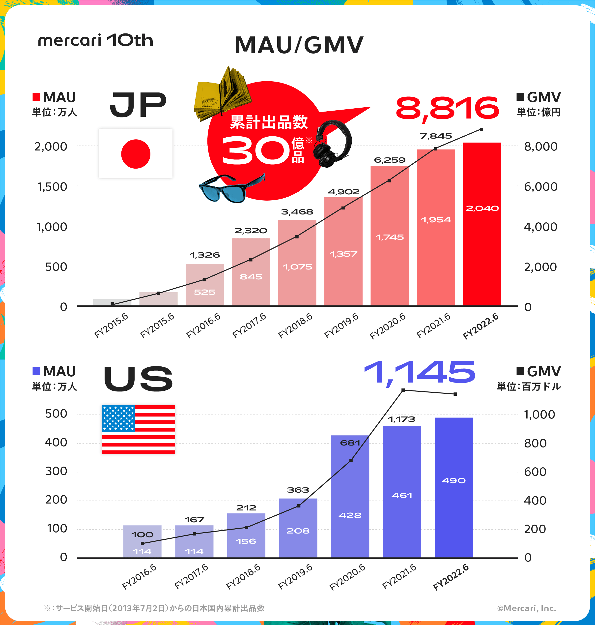 現在、「メルカリ」は月間2,000万人以上(※1)のお客さまにご利用いただいており、累計出品数は30億品以上(※2)、年間GMVは8,816億円※3のマーケットプレイスになりました。US版メルカリについてもMAU493万人※1・年間GMV11億ドル以上(※3)と、成長を続けています。また、スマホ決済サービス「メルペイ」は1,394万人※1にご利用いただいているほか、株式会社メルコインを通じたブロックチェーン・暗号資産を活用したサービスなど、新規事業へも乗り出しています。