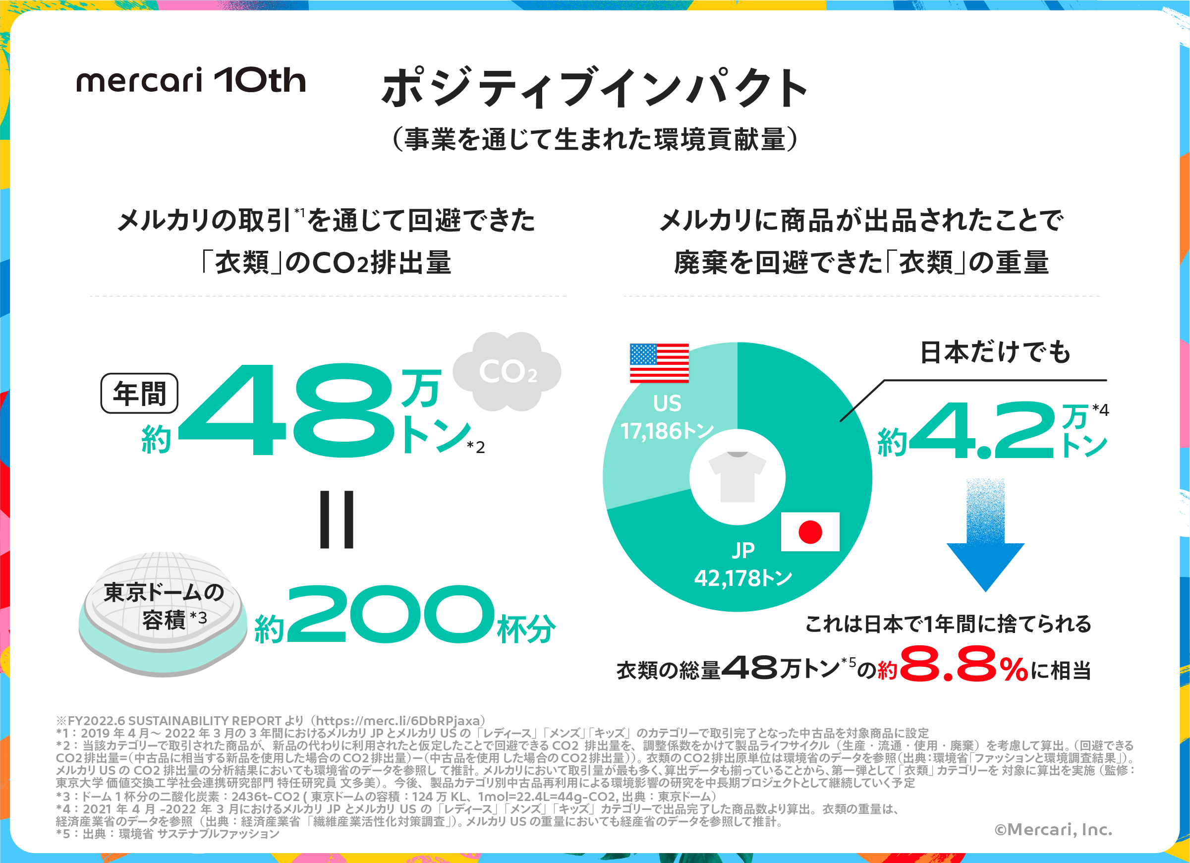 ※5:2019年4月-2022年3月の3年間におけるメルカリJPとメルカリUSの「レディース」「メンズ」「キッズ」のカテゴリーで取引完了となった中古品を対象商品に設定。メルカリにおいて取引量が最も多く、算出データも揃っていることから、第一弾として「衣類」カテゴリーを対象に算出を実施(監修:東京大学 価値交換工学社会連携研究部門 特任研究員 文多美)。今後、製品カテゴリ別中古品再利用による環境影響の研究を中長期プロジェクトとして継続していく予定。「FY2022.6 SUSTAINABILITY REPORT」より