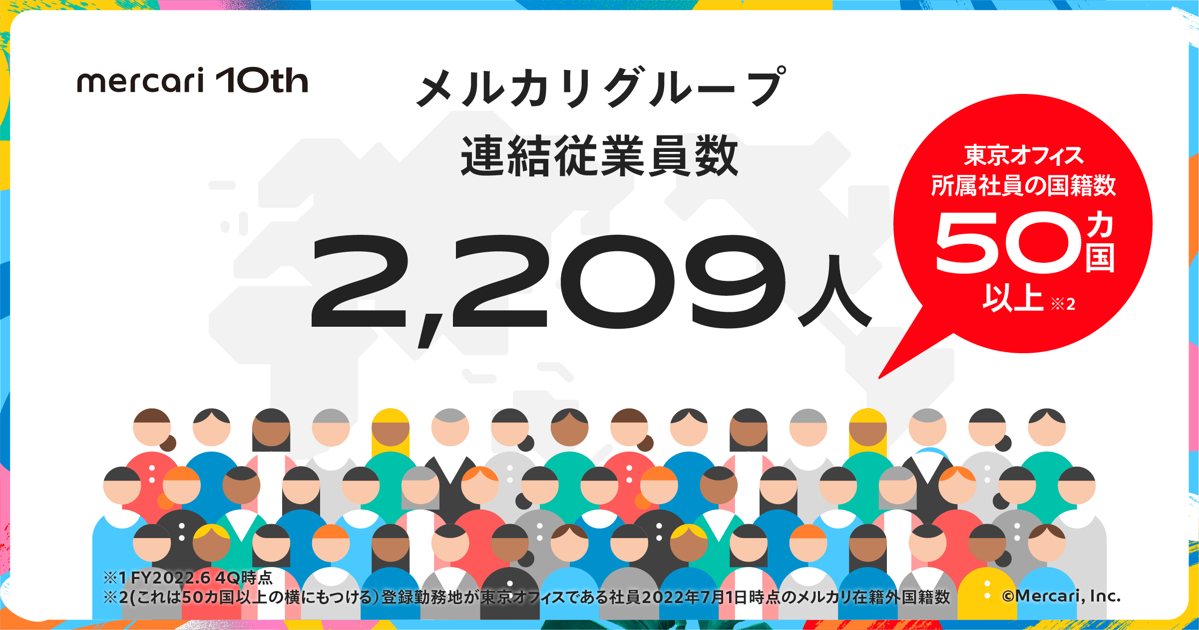 なお、「世界的に競争力のある組織」を目指すメルカリグループには現在、世界50カ国以上から2,200人以上(※8)の社員が集まっています。この10年間で、ミッション達成に向けた積極的な海外採用の強化やインド開発拠点の設立、それに伴いダイバーシティ&インクルージョン(多様性の受容)も推進(※9)し、社内制度においても、福利厚生制度「merci box」(※10)や新しいワークスタイル「YOUR CHOICE」(※11)を導入するなど、多様な人材が活躍できる環境を創るべく、様々な取り組みを進めています。