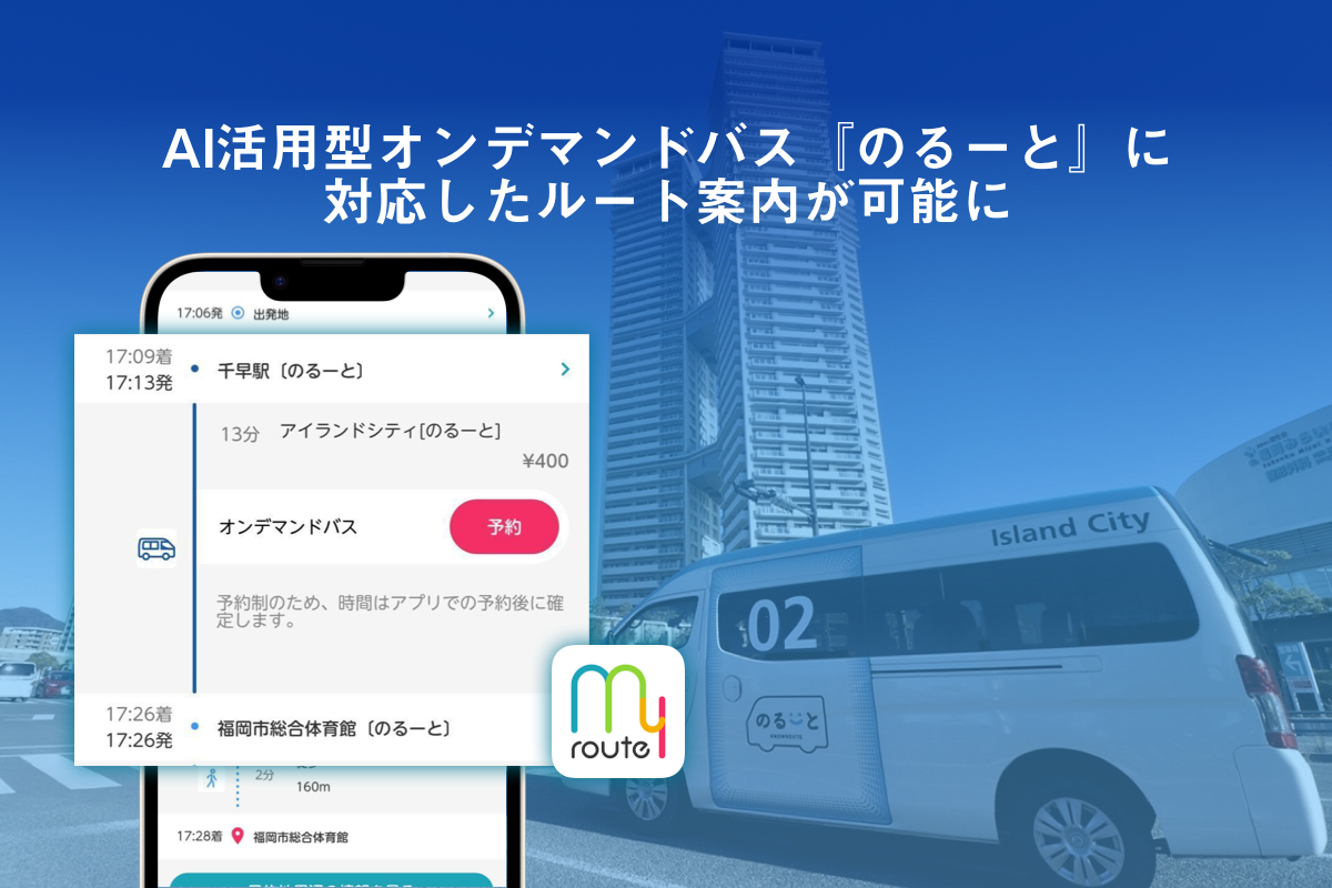 トヨタファイナンシャルサービス株式会社(代表取締役社長:頃末 広義、本社:愛知県名古屋市)、株式会社ナビタイムジャパン(代表取締役社長:大西 啓介、本社:東京都港区)、西日本鉄道株式会社(代表取締役社長執行役員:林田 浩一、本社:福岡県福岡市)、ネクスト・モビリティ株式会社(代表取締役社長 兼 COO:田中 昭彦、本社:福岡県福岡市)は、2022年11月1日(火)より、マルチモーダルモビリティサービス『my route』にて、AI活用型オンデマンドバス『のるーと』に対応したルートの提供を開始いたします。