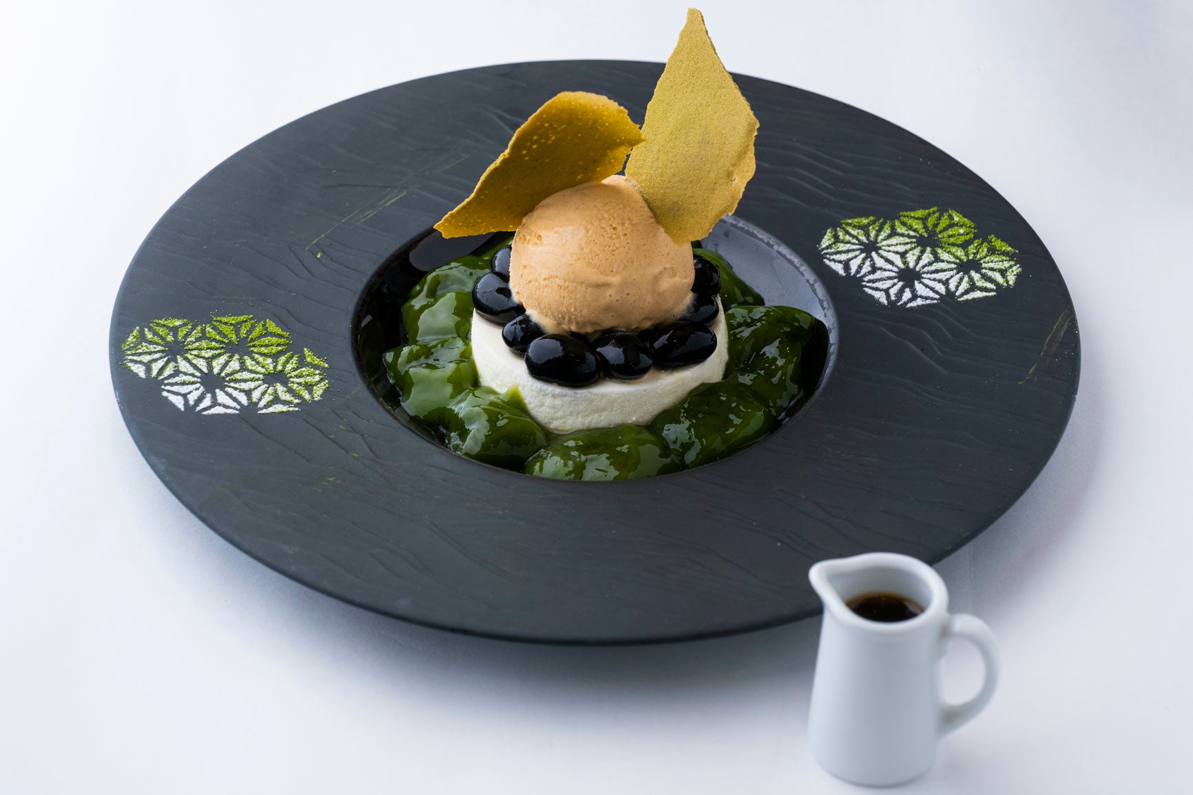 真っ白な練乳のムースに本和香糖で炊いた丹波黒豆の飛切を重ね、きなこのアイスと抹茶のわらび餅をあしらったひと品。仕上げにほうじ茶蜜のシロップを添えた、和を感じるスイーツです。
