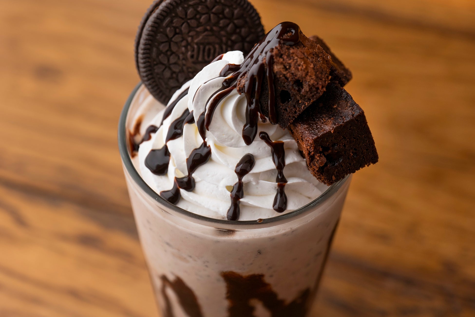 チョコレートソースとブラウニーを贅沢に盛り付けたシェイクは、中にもソースとチョコクッキーが入っていて食べ応え抜群。シンプルな組み合わせは、リピートしたくなること間違いなし!