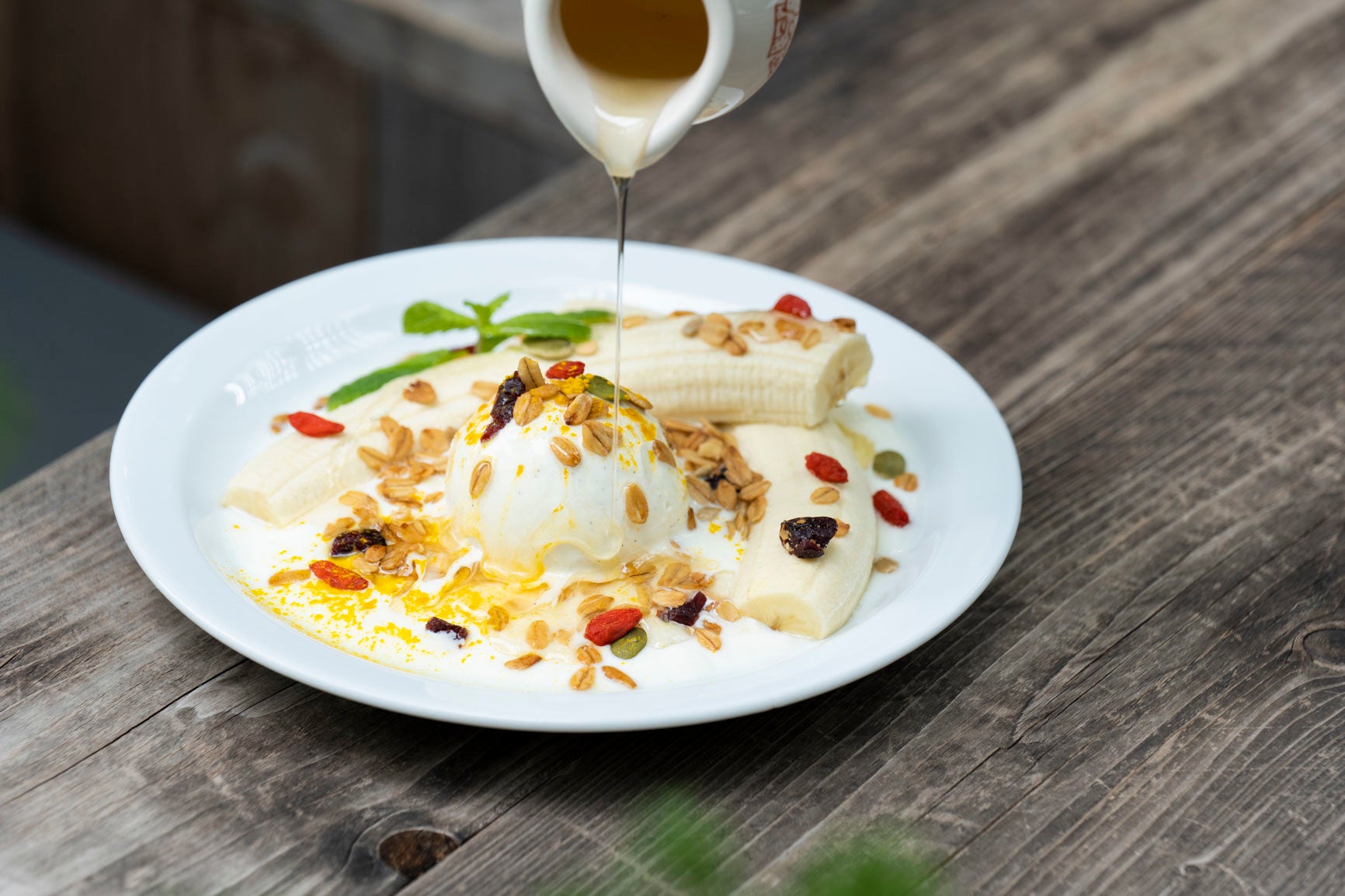 オートミールにバナナとヨーグルト、クコの実などをトッピングしてターメリックの香りを効かせた世界中の〈ル・パン・コティディアン〉で愛されている人気メニュー。バニラアイスを添えて、東京ミッドタウン店限定でご用意しました。