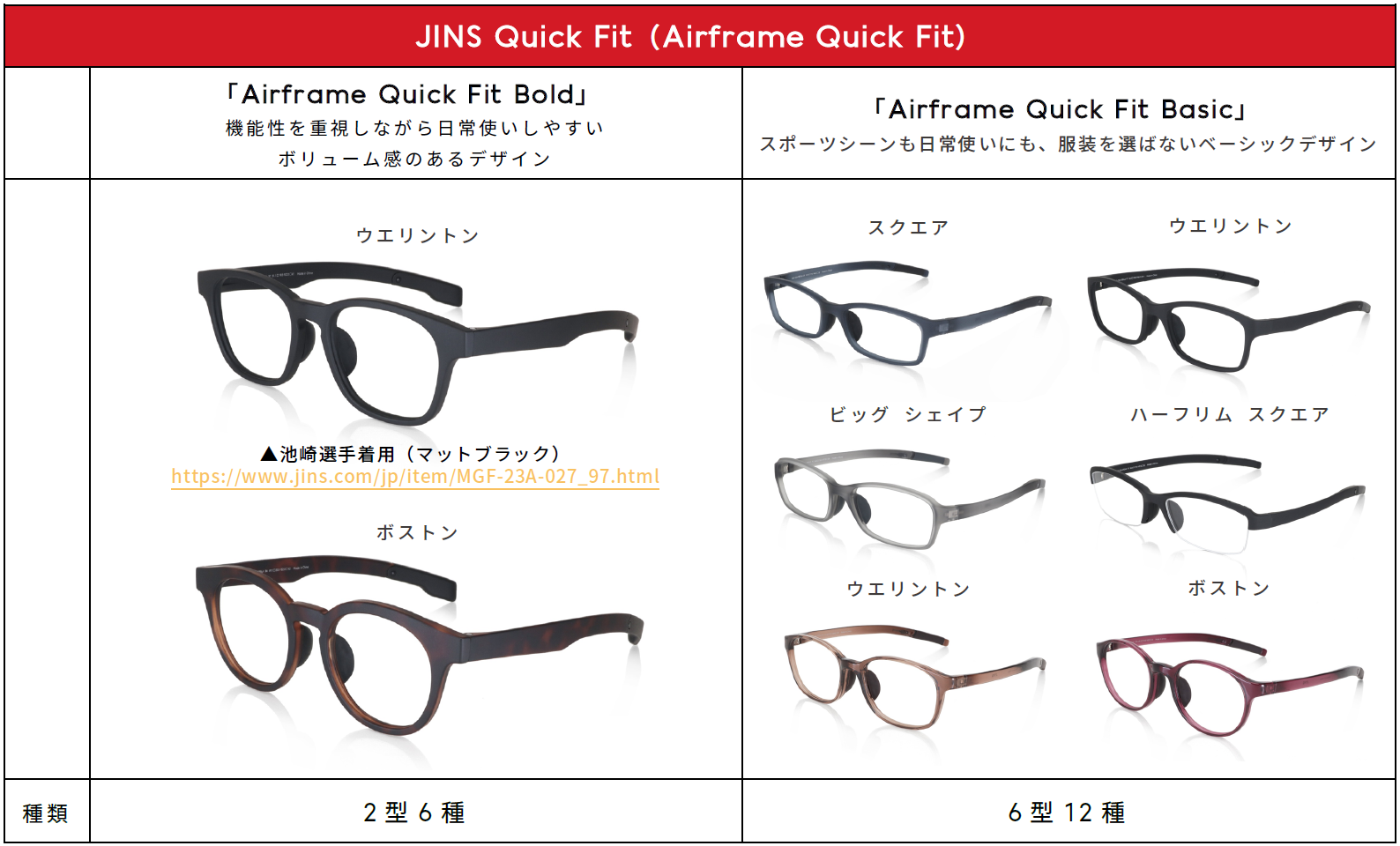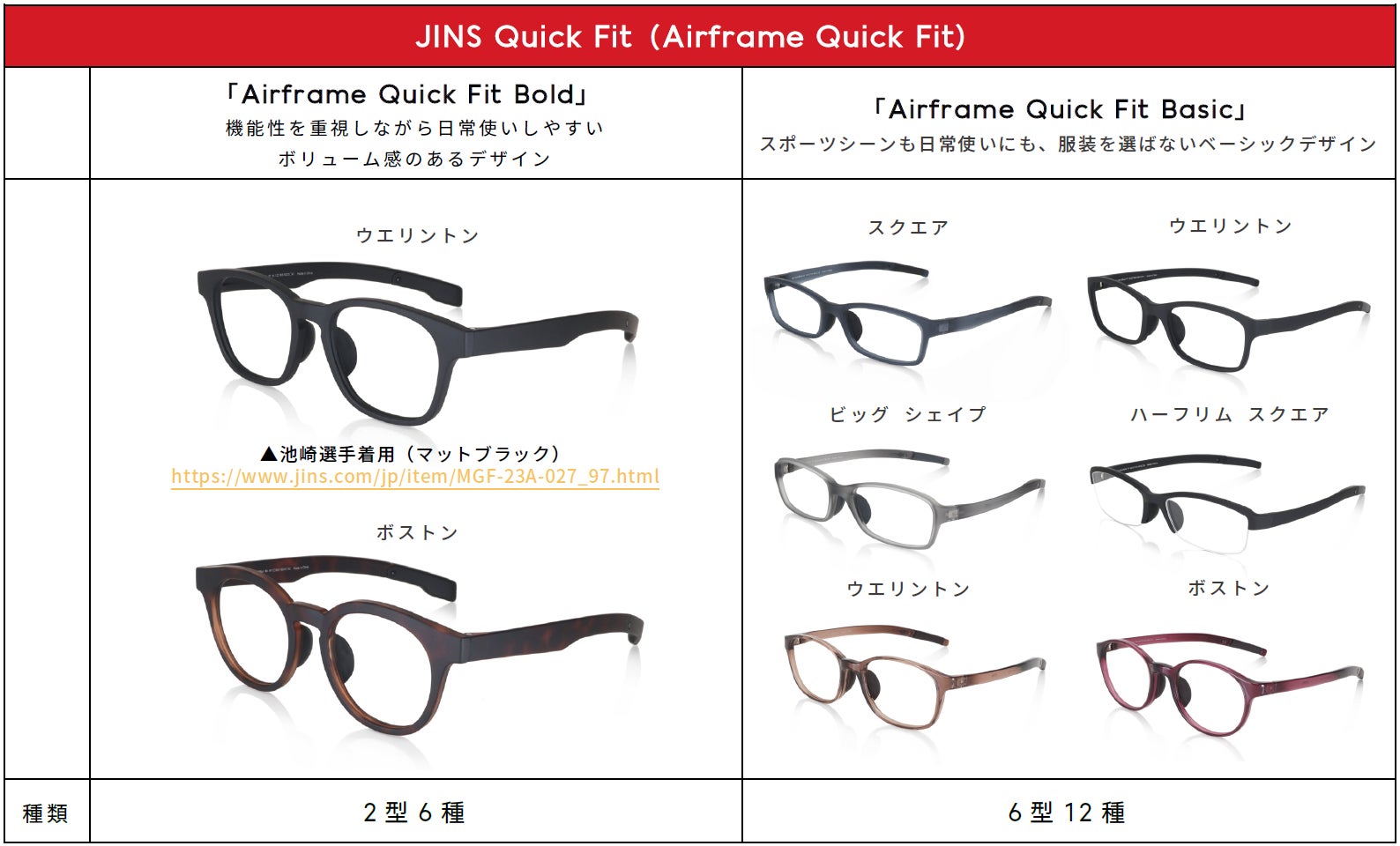 シーンや好みにあわせて素早くフィット感を調整でき、JINSが業界に先駆けて採用した軽量樹脂素材のTR-90により、かけ心地も追求。長時間かけても疲れにくいのも特徴です。9月末には、日常使いしやすいボリューム感のあるデザインの新モデル「Airframe Quick Fit Bold」をラインアップに追加し、発売以降から約1ヵ月※1で計画比148%とご好評をいただいております。