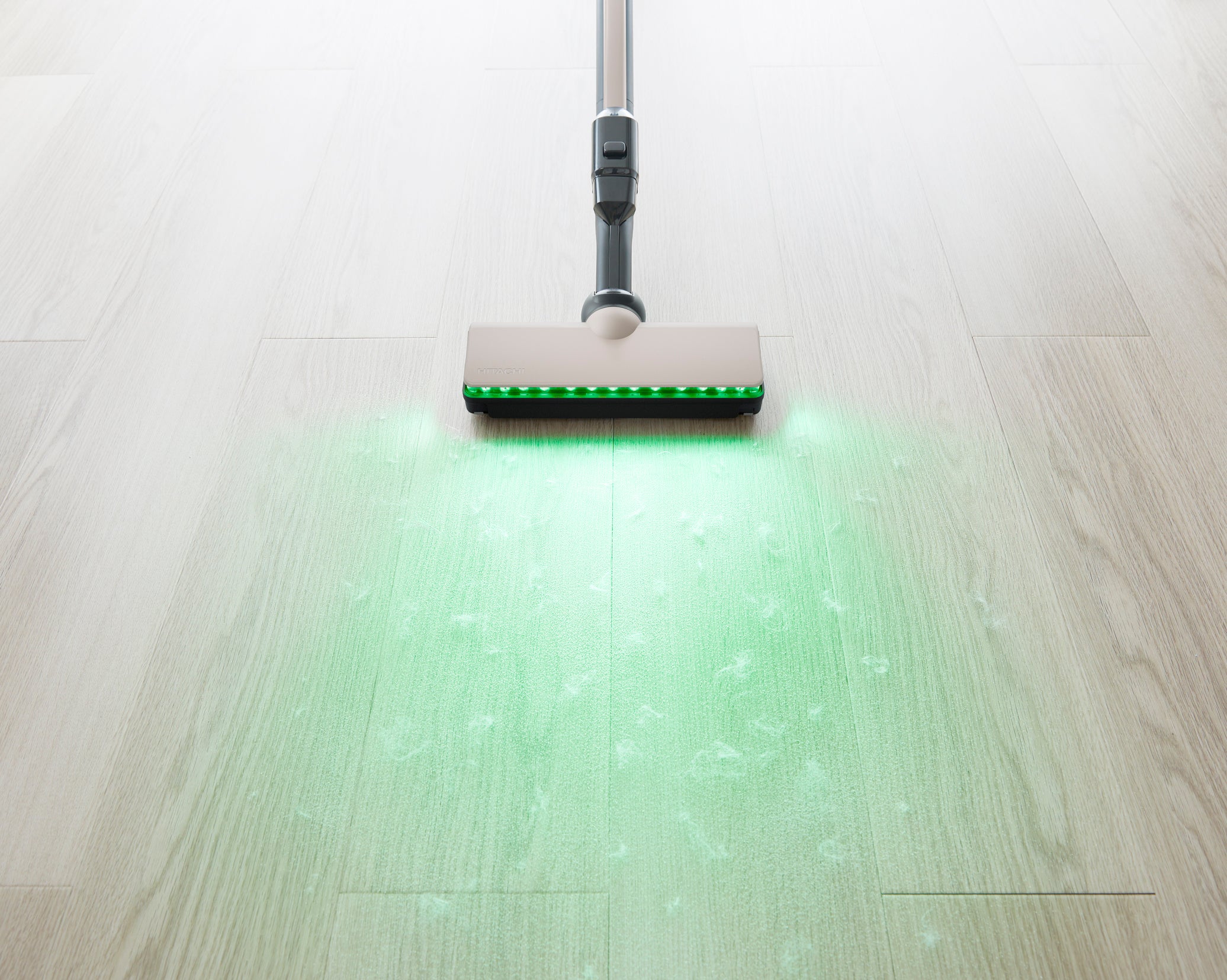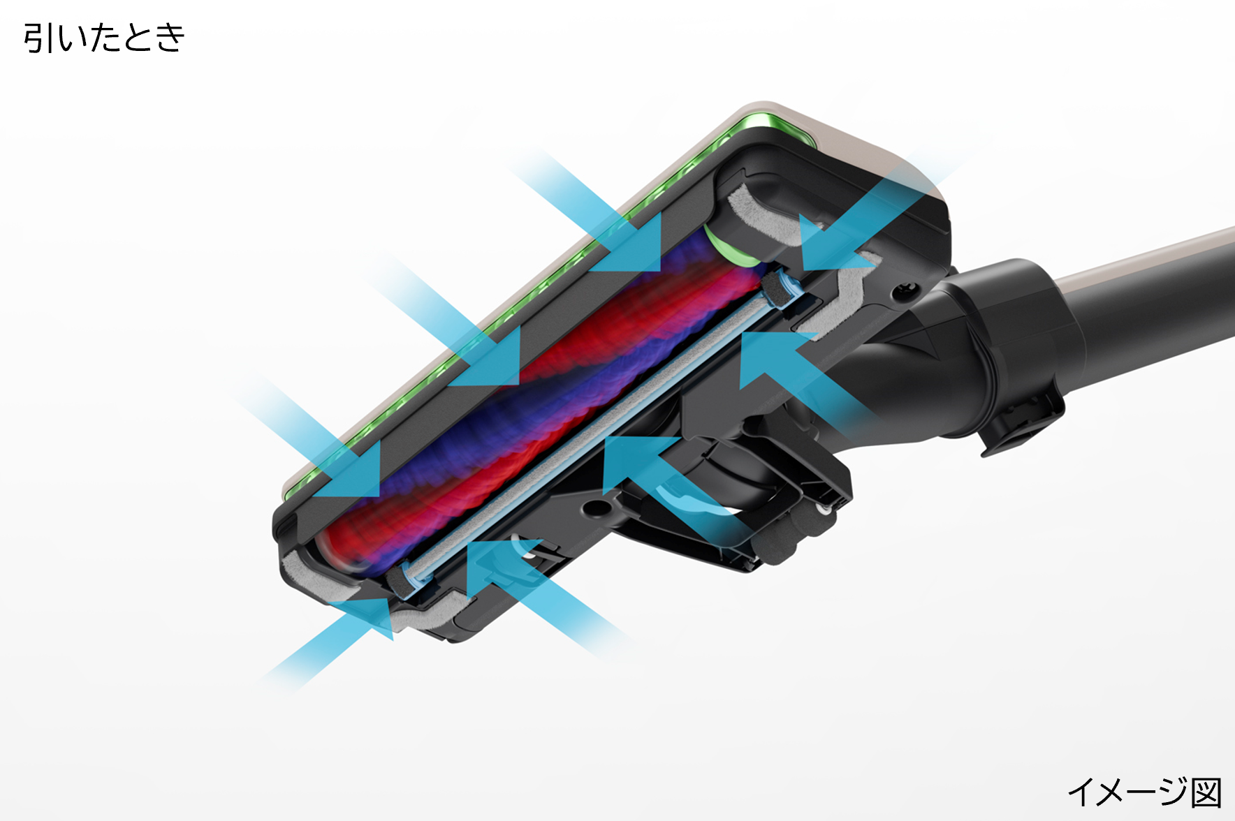 本製品では、ヘッドに「パワフル スマートヘッド plus」を新たに採用。同ヘッドに搭載している「3方向ごみくっきりライト」は、緑色と白色を含むLEDライトで前だけでなく左右も照らし、広い範囲の見えにくいごみを浮かび上がらせる。普段の床掃除では広い範囲を照らし、ヘッド前部が壁についた状態でも左右のごみを見つけやすくなる。また、前後だけでなく左右からも吸引できる「4方向吸引機構」を採用した。前方や後方に加え、今回新たに設けた左右の流路から、横方向のごみを吸引するため、壁ぎわのごみも吸い込むことができる。さらに、回転ブラシには、軽い力でヘッドが前に進む「自走機能」に加え、異なる角度のブラシがごみをしっかりかき出す「2アングル形状」を採用した。