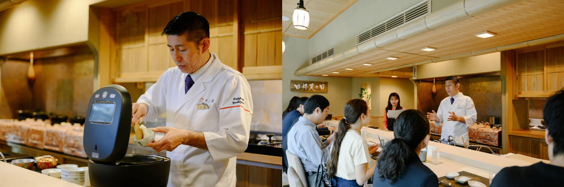 本試食会では特別にJRX-T型の土鍋ごはんを振る舞っていただきましたが、通常、料亭「よし澤」では、吉澤氏オリジナルの(直火で炊く)土鍋で炊いた炊きたてごはんを、お客様のお料理の進み具合をみながら、ここぞというタイミングで提供するなど、土鍋ごはんにこだわりを持っています。
