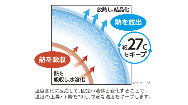 PCM(Phase Change Material)とは…宇宙空間での急激な温度変化にも対応するとされている、温度調節機能を持つ特殊素材です。