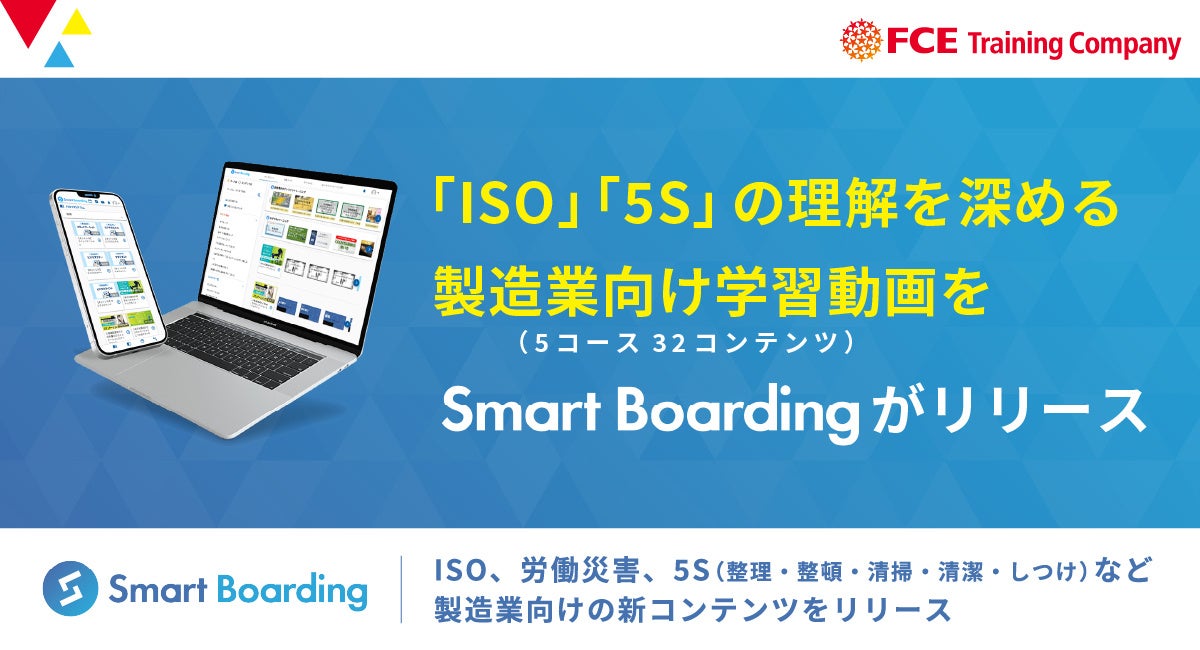 株式会社FCEトレーニング・カンパニー(本社:東京都新宿区、代表取締役社長:荻野純子)が提供する、「Smart Boarding」(スマートボーディング)(https://www.smartboarding.net/)は、ISO、労働災害、5S(整理・整頓・清掃・清潔・しつけ )など製造業向けの新コンテンツをリリースいたしました。