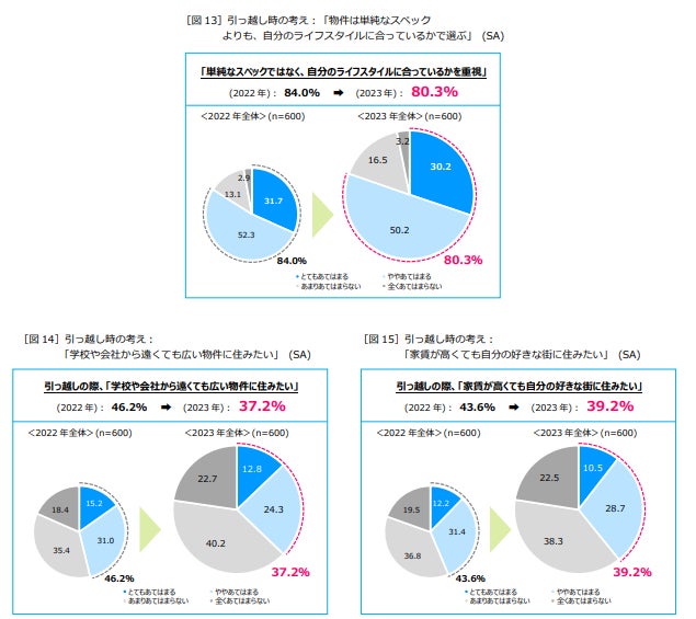 引っ越し時の考え方について聞いたところ、「物件は単純なスペックではなく、自分のライフスタイルに合っているかで選ぶ」(「とてもあてはまる」「ややあてはまる」の合計:80.3%)は、昨年度より3.7ポイント減少。「学校や会社から遠くても広い物件に住みたい」(同37.2%)は、9.0ポイント減少し、リモートワークやオンライン授業などが解除になる動きによる影響が考えられます。「家賃が高くても自分の好きな街に住みたい」(39.2%)も4.4ポイント減少。コロナ禍にありながらも2022年は、部屋選びに影響する価値観にも変化があったことを感じさせる結果となりました[図13~15]。