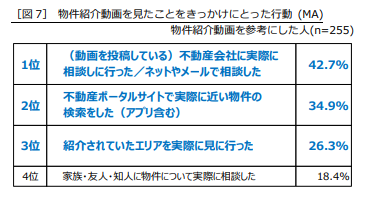 物件紹介動画を見たことをきっかけにとった行動では、1位が「(動画を投稿している)不動産会社に実際に相談しに行った/ネットやメールで相談した」(42.7%)で、4割以上の人が不動産会社まで相談をしていることが分かりました。2位は「不動産ポータルサイトで実際に近い物件の検索をした」(34.9%)で、3割以上が動画で見た部屋に近いものを不動産ポータルサイトやアプリで見つけることを試みています。3位は「紹介されていたエリアを実際に見に行った」(26.3%)となり、4人に1人以上が動画で見つけた気になる部屋のあるエリアに直接足を運んでいます。物件紹介動画を見たことをきっかけに、具体的なアクションにつながったという人が多いことが分かりました[図7]。