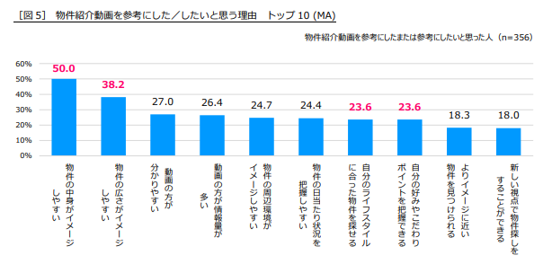 物件紹介動画を参考にした、または参考にしたいと回答した人にその理由を聞くと、1位「物件の中身がイメージしやすい」(50.0%)、2位「物件の広さがイメージしやすい」(38.2%)と、上位2項目は「不動産ポータルサイトやアプリについて不満に感じること」[図3]と逆の結果でした。「中身」や「広さ」のイメージがしづらいという従来の物件検索のデメリットを物件紹介動画は補っているといえます。