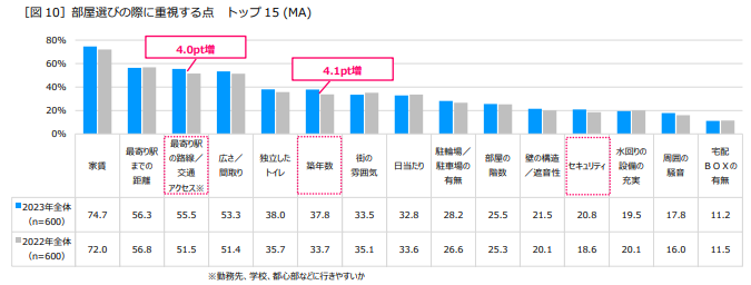 昨年と比較すると、「築年数」(37.8%)は7位から6位にランクアップして4.1ポイント増、「最寄り駅の路線/交通アクセス」は4.0ポイント増加、「セキュリティ」(20.8%)は13位から12位にランクアップして2.2ポイント増加しました[図10]。