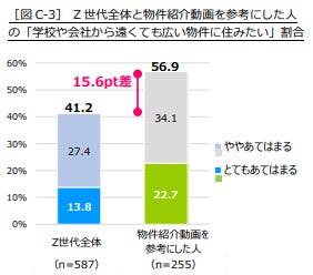 引っ越し時に「学校や会社から遠くても広い物件に住みたい」と考える人の割合でも、「Z世代全体」が41.2%(「とてもあてはまる」「ややあてはまる」の合計)であったのに対し、「物件紹介動画を参考にした人」は56.9%で15.6ポイント多い傾向が見られました。学校や職場へのアクセスの良さよりも部屋の広さを優先し、動画を参考に、自宅での暮らしを優先的に考えて部屋選びをしている様子がうかがえました。