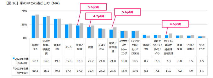 家の中での過ごし方について聞いたところ、全ての項目で割合が微減し、コロナ禍からの脱却を感じさせる結果となりました。1位の「料理」(57.7%)は昨年度から2.6ポイント減少したものの、依然として約6割と高い割合で、多くの人が自炊をしていることが分かりました。特に減少率が大きかったのは5位「仕事/勉強」(32.3%)と8位「電話/音声通話」(21.8%)がともに5.6ポイント、6位「読書」(27.7%)が4.7ポイント、13位「オンライン講座や通信講座を受講」(7.3%)が4.6ポイントそれぞれ減少しており、家での仕事や勉強の機会が減っている様子がうかがえます。外出機会が増え、通勤・通学が復活し、徐々に自宅での過ごし方に変化が起きているといえそうです[図16]。