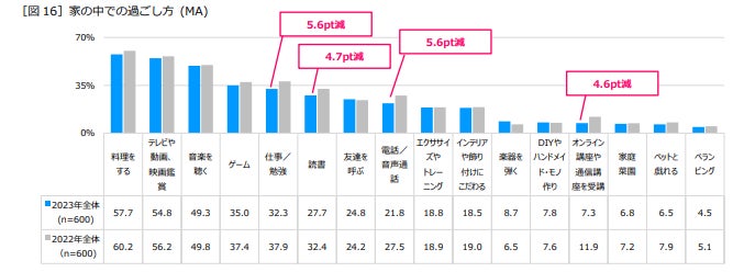 2.家での過ごし方は「料理」が変わらず最も高いが、「仕事・勉強」「電話」をする人は減少