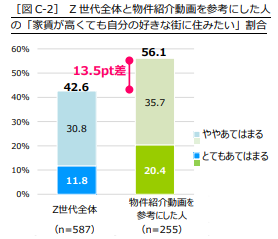 引っ越しをする時の考え方について、「家賃が高くても好きな街に住みたい」と回答した割合は、 「Z世代全体」が42.6%(「とてもあてはまる」「ややあてはまる」の合計)に対し、「物件紹介動画を参考にした人」は56.1%で13.5ポイント多いことが分かりました。