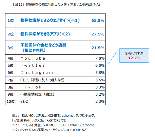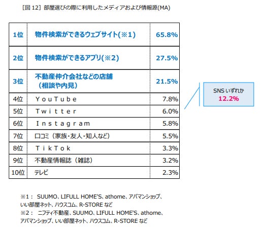 トップ10には「YouTube」(7.8%)、「Twitter」(6.0%)、「Instagram」(5.8%)、「TikTok」(3.3%)といったSNSもランクインし、「SNSいずれか」を利用していると回答した人は12.2%に上り、1割以上の人が部屋選びにもSNSを活用している実態が明らかになりました[図12]。