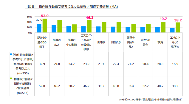 8.物件紹介動画で参考になった情報は「駅からの道のりの様子」が1位、一方期待することでは「エアコン/トイレなどの状態」「家賃」とZ世代のリアルが浮き彫り