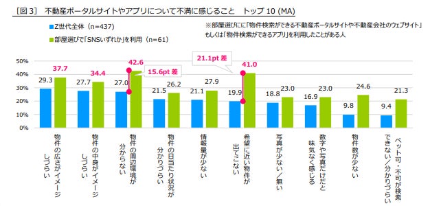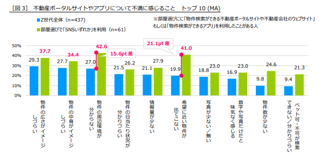 また、最も回答に差が見られたのは「希望に近い物件が出てこない」(41.0%、全体より21.1ポイント多い)でした。SNSの「レコメンド機能」により好みに合った情報が自動的に表示されることに慣れた人にとっては、希望の条件等を手動で細かく設定するポータルサイトやアプリは使いづらいと感じるのかもしれません[図3]。