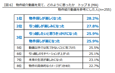 物件紹介動画を参考にしたことがある人に、動画を見てどのように思ったかを聞くと、1位「物件探しが楽しくなった」(28.2%)、2位「引っ越しが楽しみになった」(27.8%)、同率3位で「引っ越したいと思うきっかけになった」「物件探しが楽になった」(25.9%)となりました。物件紹介動画を見ることによって引っ越しへのポジティブなイメージを持つことができたり、数字や写真だけでは味気なく感じることもある部屋探しも楽しめるようになったりしている様子がうかがえます。5位の「動画以外では気づかないことに気づけた」(25.5%)や、8位「物件の具体的なイメージがつかめた」(22.7%)といったように、物件紹介動画でないと知り得なかった情報を得られたという人も多いようです[図6]。