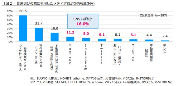 部屋選びの際に利用したメディアや情報源は、「物件検索ができるウェブサイト(※1)」(60.5%)が圧倒的多数派に。2位の「物件検索ができるアプリ(※2)」(31.7%)とあわせて、物件検索サイトやアプリの利用率が高いようです。一方、「SNSいずれか」を回答した人は16.0%で、3位「店舗」(19.9%)に次いで活用されています。今後、Z世代をはじめとする若い世代では、さらに部屋選びにおいてもSNSの活用が広がる可能性が感じられます[図2]。