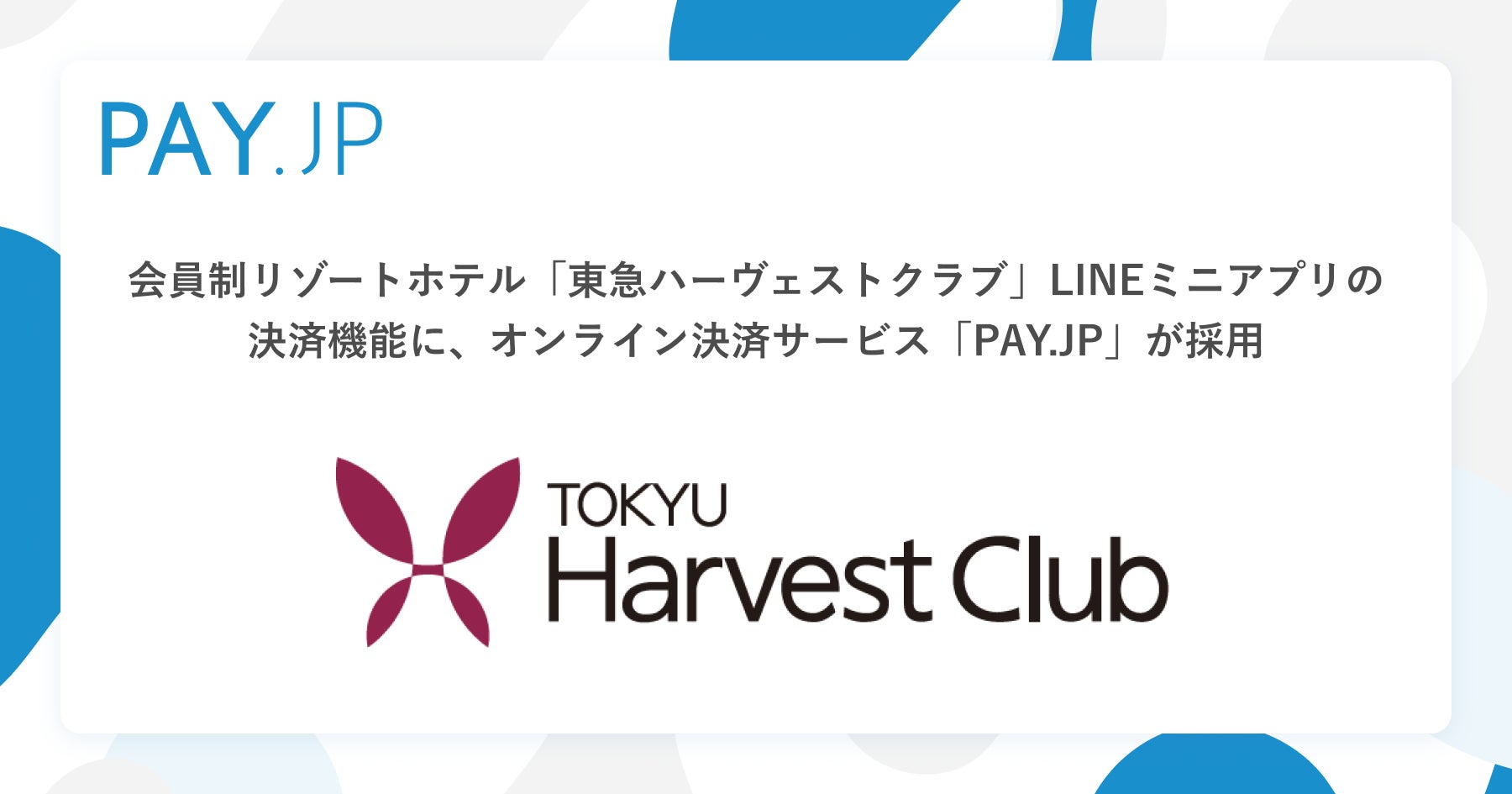 この度、PAY株式会社(所在地:東京都港区、代表取締役CEO:高野 兼一)は、東急リゾーツ&ステイ株式会社が運営する会員制リゾートホテル 「東急ハーヴェストクラブ」LINEミニアプリに、オンライン決済サービス「PAY.JP(ペイドット ジェーピー)」が導入されたことをお知らせいたします。「東急ハーヴェストクラブ」は、東急不動産が展開している会員制リゾートホテルで、「東急ハーヴェストクラブ」各施設でのチェックアウトの精算の際に利用可能なLINEアプリの決済機能として「PAY.JP」が利用されています。