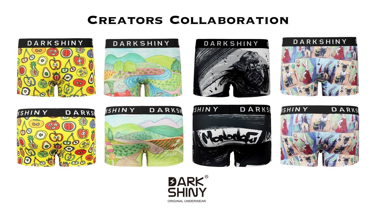 DARK SHINYクリエイターズコラボは、クリエイターの世界観が表れたデザインが豊富なアンダーウェアをキャンバスとした作品です。「自分の作品を様々な形で世の中に残していきたい」、「インパクトがある商品をきっかけに、一人でも多くの人に知ってもらいたい」という思いを持ったクリエイターを応援する目的で展開。新しいものを探している人、他人とは違うものを持ちたい人、推しクリエイターを応援したい人に、眺めて楽しむ喜び、穿いて楽しむ喜びを提供できるギャラリーのような存在を目指しています。好きなクリエイターの作品をいつでも身につけることができ、クリエイターをアンダーウェアという作品を介して応援できるのが「DARK SHINYクリエイターズコラボ」なのです。