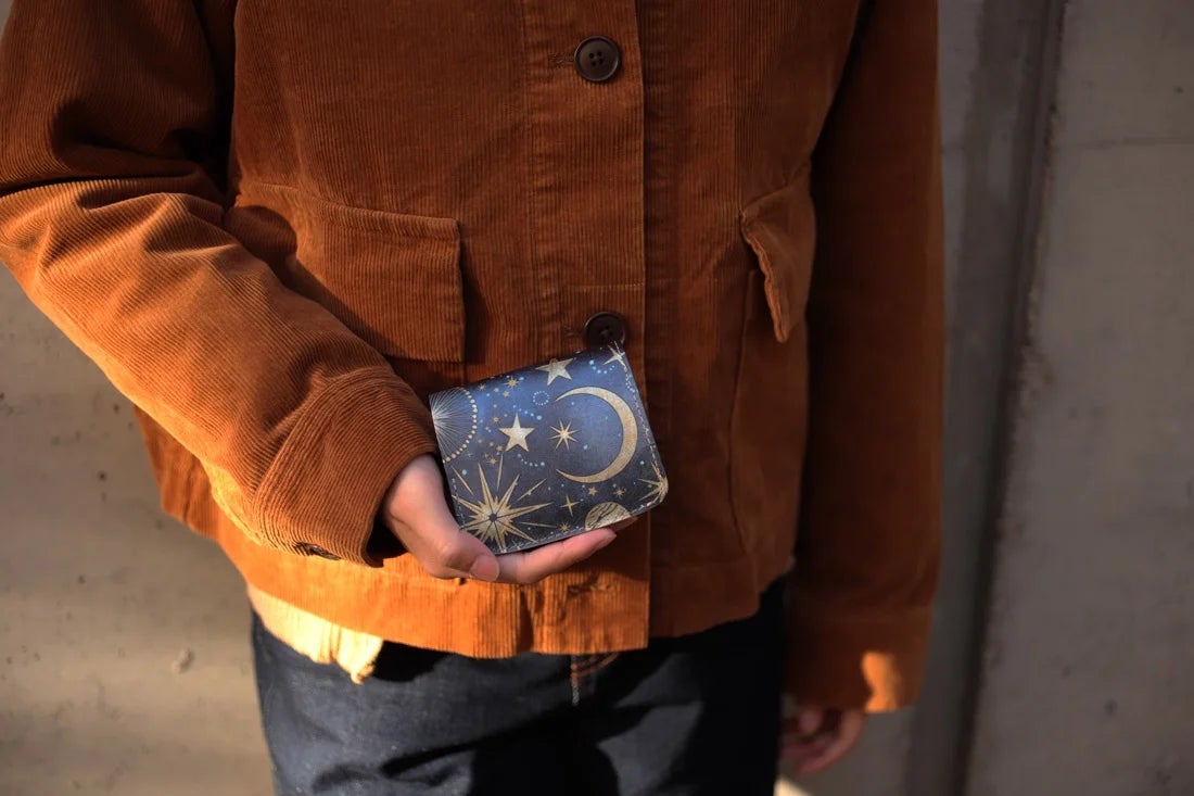 星の煌めく夜空をデザインしたミニ財布「小さいふ」Starry Night。表にはシルバーのJAPANレザー、内側には栃木レザーを使用。