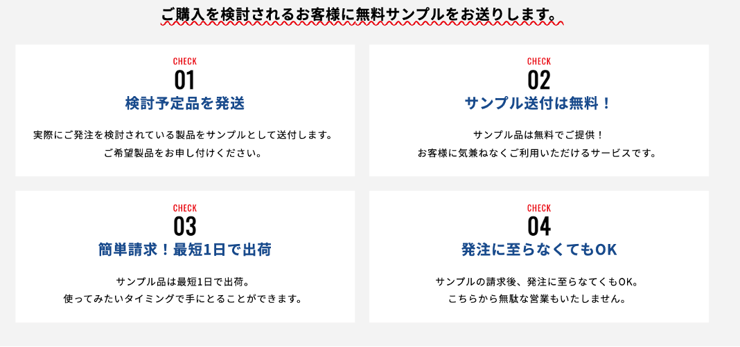 発注を検討している製品は、無料サンプルとしてご提供します。サンプルは最短1日で出荷でき、無料であることから、気兼ねなくご利用いただけるとお客様から好評です。また、サイトに品質やサイズの製品情報を豊富に記載しているため、安心してお問い合わせいただけます。