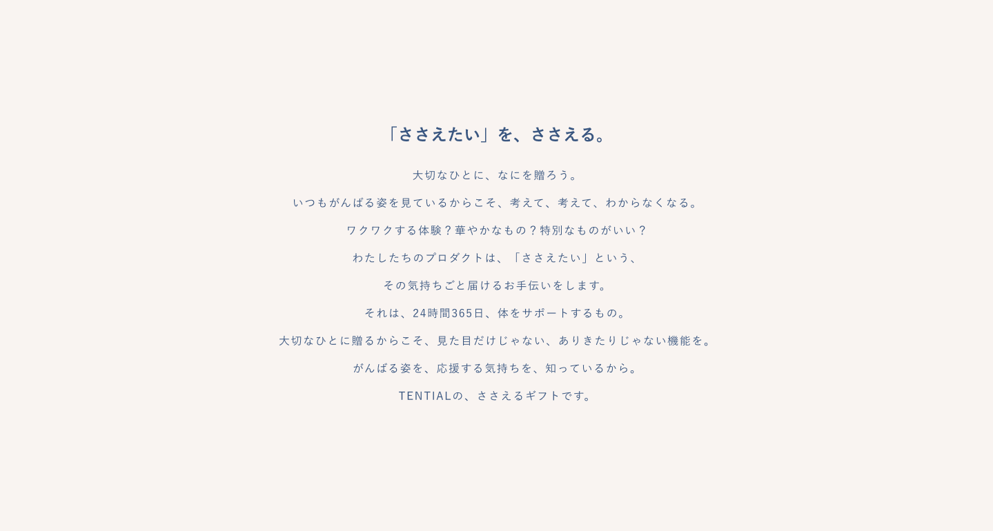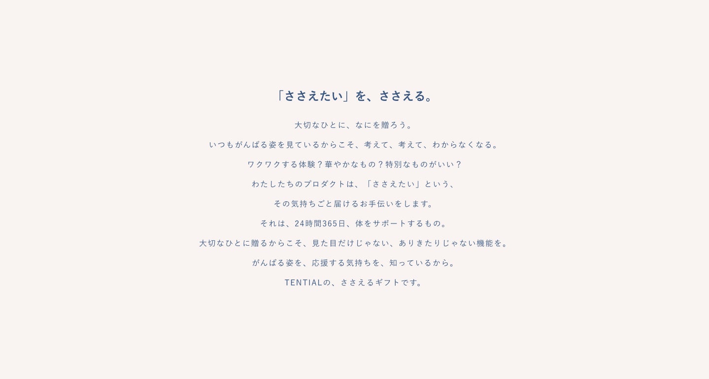 TENTIALの『ささえるギフト』は、大切に思う人々への「健康をささえたい」「この先もずっと元気でいてほしい」「やりたいことに挑戦してほしい」という想いを具現化するものです。今後も『ささえるギフト』という新しいギフトの選択肢を啓蒙し、健康で前向きな社会の実現に寄与してまいります。