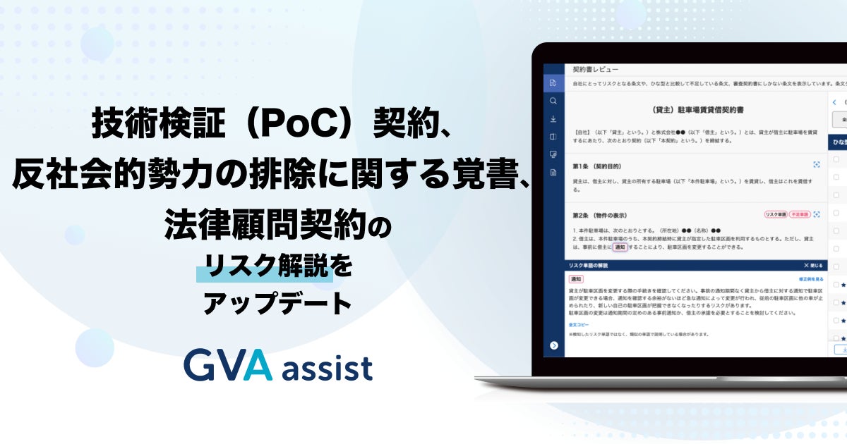 GVA TECH株式会社(本社:東京都渋谷区、代表取締役:山本 俊、以下GVA TECH)は、AI契約書レビュー支援クラウド「GVA assist(ジーヴァ アシスト)」に標準搭載しているGVAプレイブックのうち、技術検証(PoC)契約、反社会的勢力の排除に関する覚書、法律顧問契約など5通のリスク解説を追加したことをお知らせします。今回のアップデートにより、契約書レビュー時にGVA assistが検知したリスクに関して、より詳細に書かれた弁護士監修の解説をもとに、論点の整理やリスクの検討が容易に行うことができるようになります。
