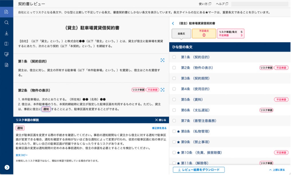 その他にも、条文検索機能、形式チェック機能、1,500種類以上のひな型ダウンロードなど、契約書レビューにおける業務負担を軽くする各種機能を提供しています。