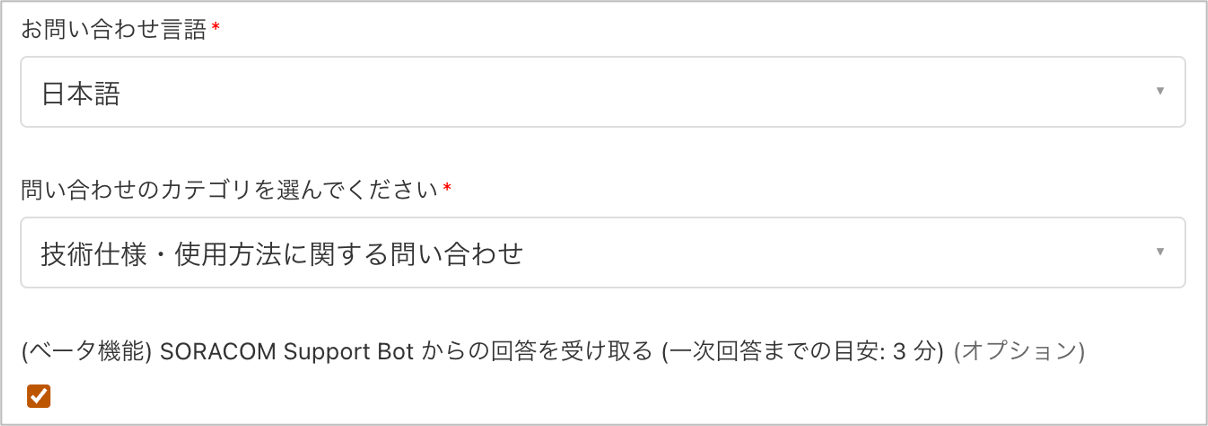 問い合わせのカテゴリとして「技術仕様・使用方法に関する問い合わせ」を選択した時のみ、SORACOM Support Botからの回答を受け取るにチェックを入れると利用できます。